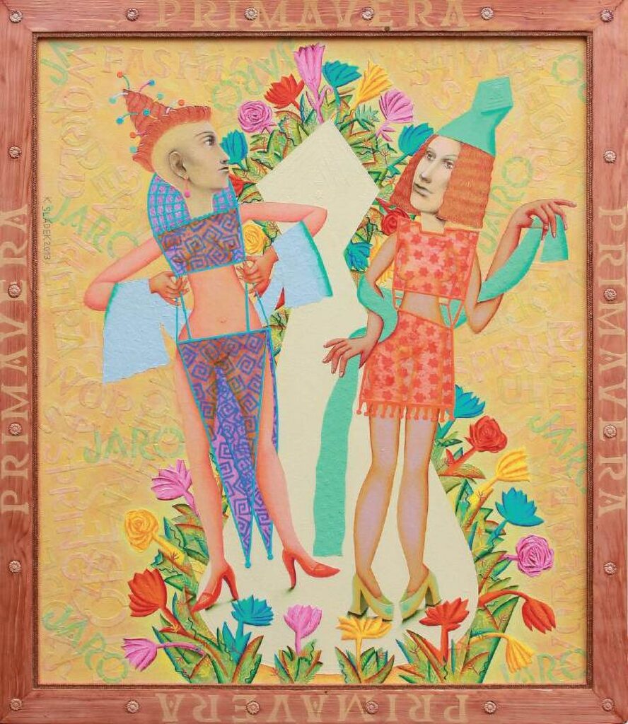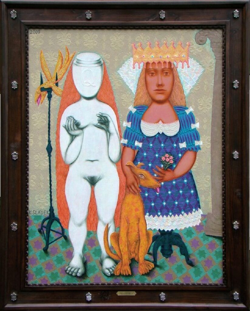 „OD SKICI DÁL K DÍLU JDE SE PO KOLENOU“ Většina vystavených a zde reprodukovaných obrazů Karla Sládka z předchozího desetiletí jeho snažení jsou víceméně divadelní výjevy. Čteme z nich příběh, vztahy, napětí, evidentní nebo latentní konflikt, malá i velká dramata.