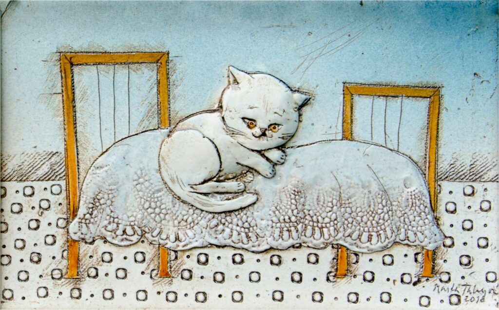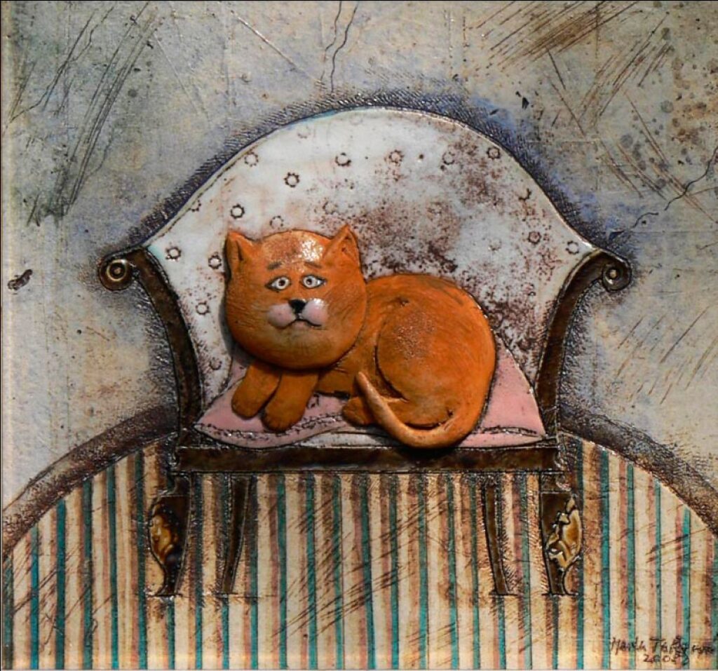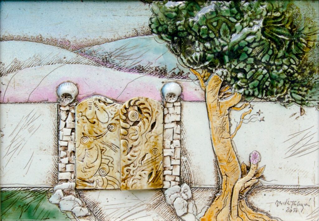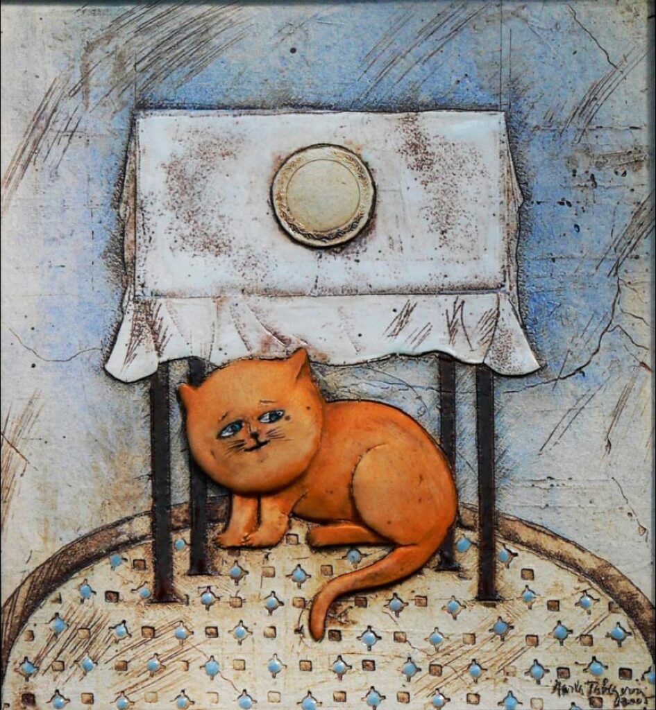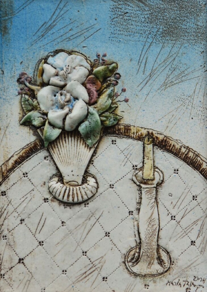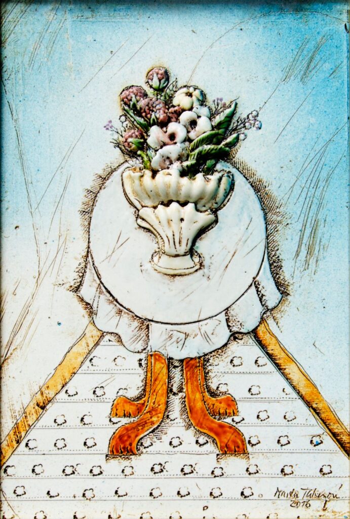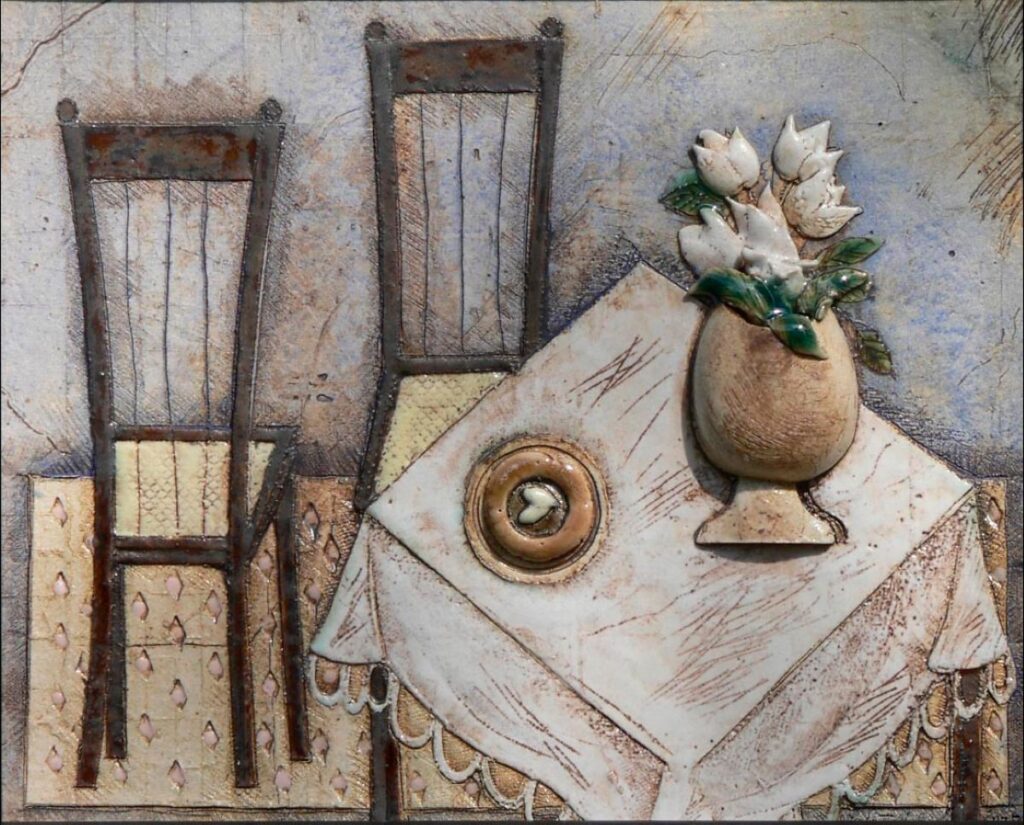 Stejný přístup je možno revokovat rovněž v éře slavných nizozemských zátiší 17. století. Nikoliv ale těch lukulských, přetékajících barokní hojností, ale zamyšlených zátiší, složených ze skromných předmětů tehdejší hmotné kultury, podaných s věrností a realismem, jak nám je zanechal, shodou okolností rovněž olomoucký rodák, Georg Flegel, nebo o něco později Francouz Nicolas Chardin. Že žije Marta Taberyová svůj život naplno, dokládá právě námětový obsah jejích reliéfních keramických zátiší: vzpomínky z cest, evokované významovými zkratkami jako antickým sloupem, jinde mořskou mušlí, nebo většími makroskopickými celky jako rozlehlostí vzdálených i domácích krajin, exotickou květenou nebo rostlinami její vlastní zahrádky. Důvěrně známé sedací nábytky okupují kočičky, v poslední době se prosazuje i svět vnuček, znázorněný hračkami, loutkami, romantickými panenkami. Mikrosvěty keramických obrazů vznikají v dílně autorky pomocí bravurně zvládnuté keramické technologie právě tak jako citlivostí sochařské modelace. Hravě působící, přesto náročný proces je dále propojen s erudovanými, léta studovanými barevnými glazurami, jejichž matný povrch oživuje bohatá povrchová struktura. Reliéfy jsou komponovány do dvou až tří perspektivních plánů, kde zejména v krajinných pohledech dokáže Taberyová v zadním plánu vyvolat iluzi dalekých obzorů.