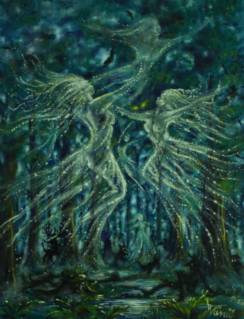 V jejích obrazech se přenesete do tajemného lesa, zatančíte si s divoženkami nebo vzlétnete do oblak a do korun stromů. Maluje a kreslí vším a na vše, co se jí dostane pod ruku – akvarel, akryl, pastel, rudka, tužka, ale ponejvíce olejovými barvami na plátno.