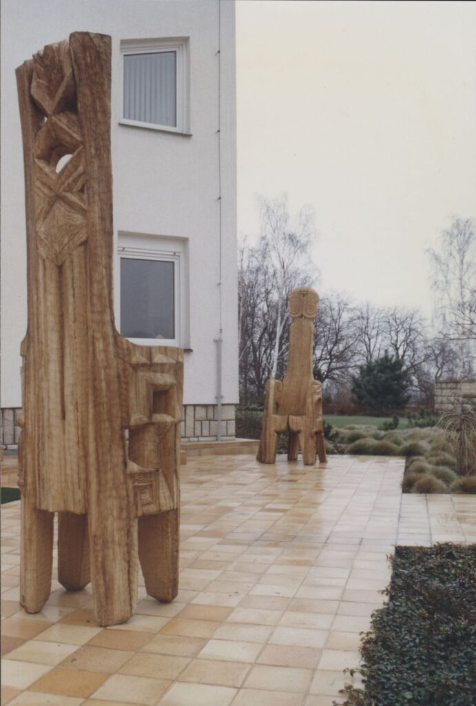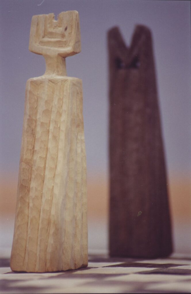 Architektonický přístup je s figurální tvorbou také často propojen jak o tom svědčí sousoší Adam a Eva, dvě stylizované vertikální stély spojené vodorovnou fošnou – lavičkou (Žďár nad Sázavou,1996 a Angouleme-Francie, 2002). Tady se uplatňují i další základní tvary opakující se ve Vlčkově tvorbě a to především v drobných detailech, trojúhelník, hvězda a spirála. Motiv Adama a Evy se znovu opakuje ve stejnojmenných trůnech vytvořených z jednoho masívu topolu a dubu (1997 a 1998).
