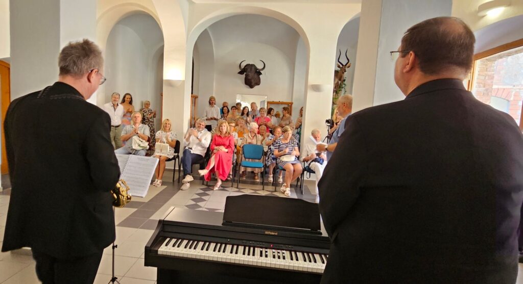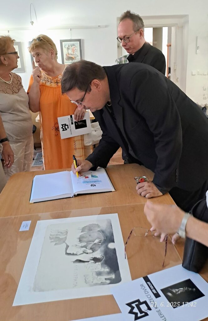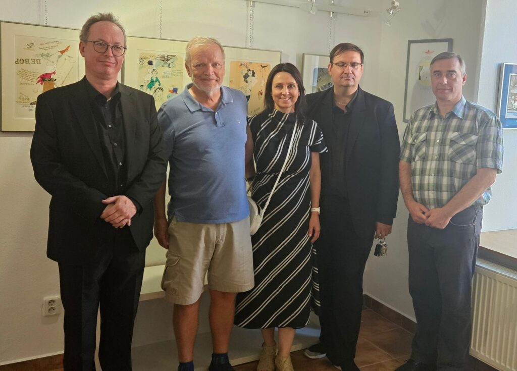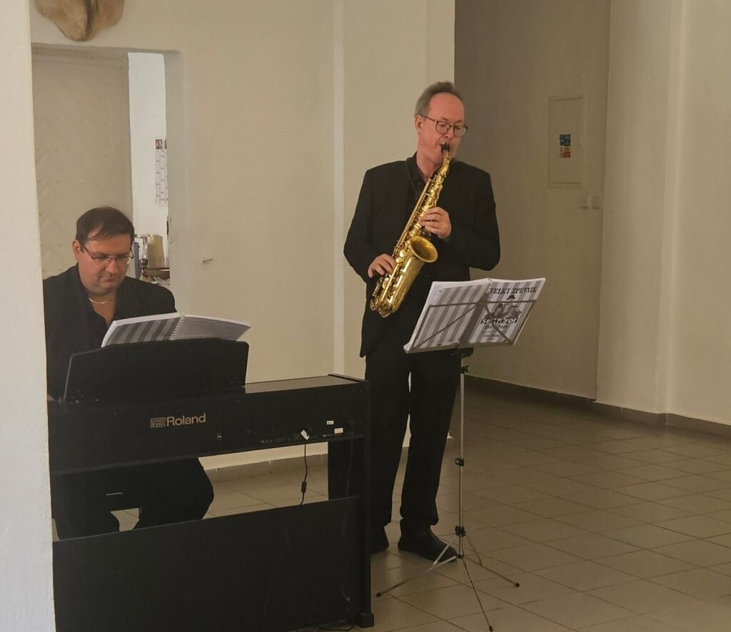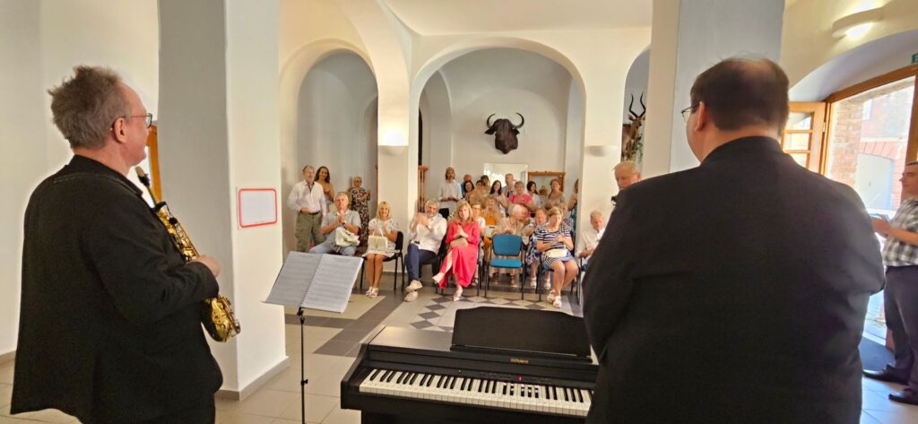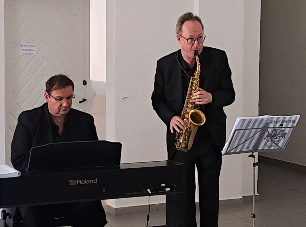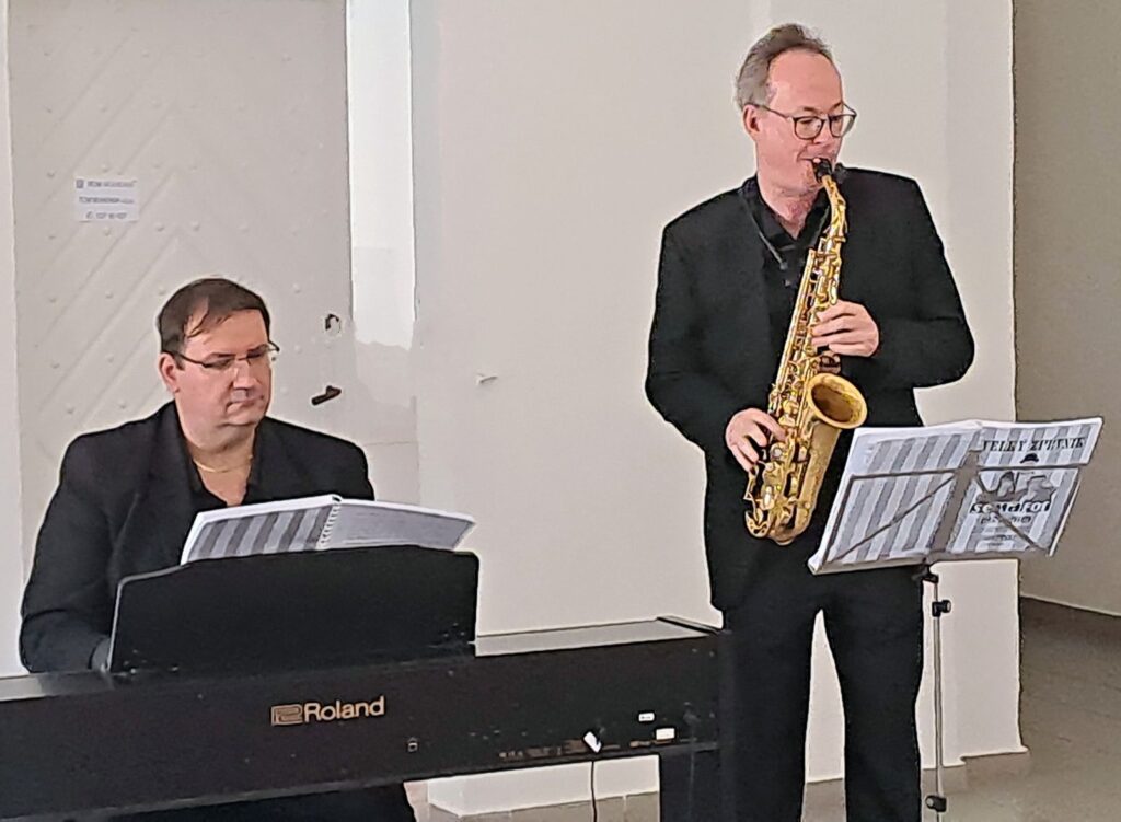 Včerejší vernisáž výstavy Jiřího Suchého proběhla v příjemné atmosféře za hojné účasti hostů. Pan Suchý se sice nemohl osobně zúčastnit, ale poslal srdečnou zdravici, kterou přečetl Jiří Jan Nepomuk Svoboda, ředitel divadla Semafor. Společně se saxofonistou Davidem Vrobelem pak hudebně doprovodili celé zahájení. O výtvarném talentu Jiřího Suchého a jeho jedinečném pohledu na svět, plném laskavé ironie a porozumění, promluvil také Mgr. František Štěrba.