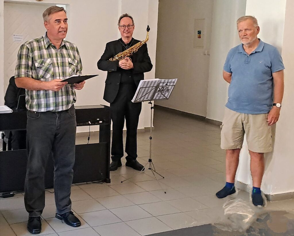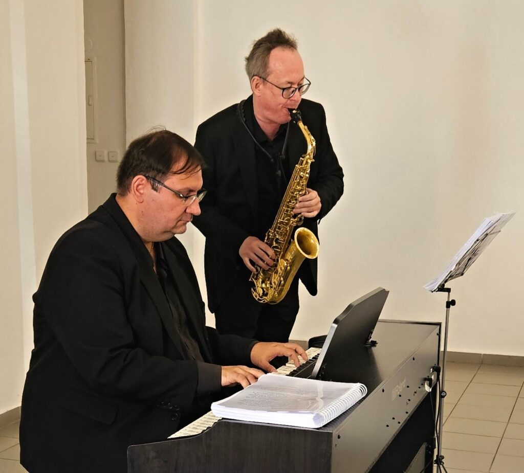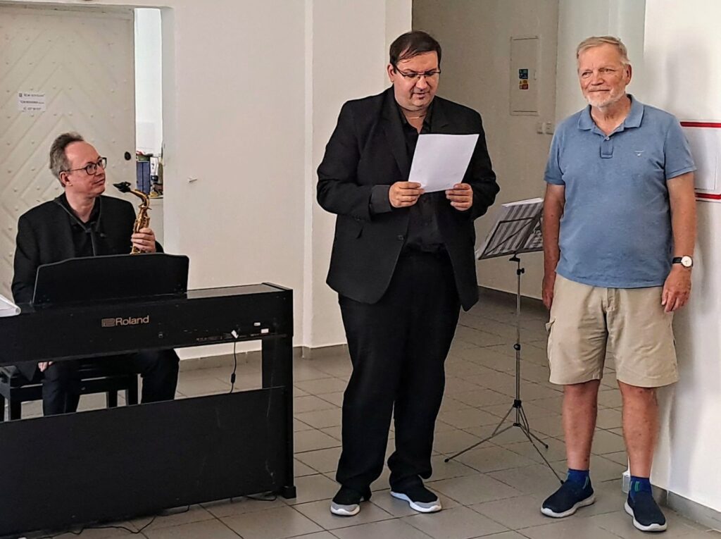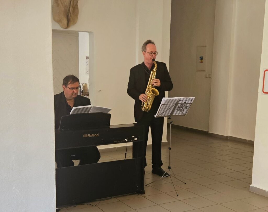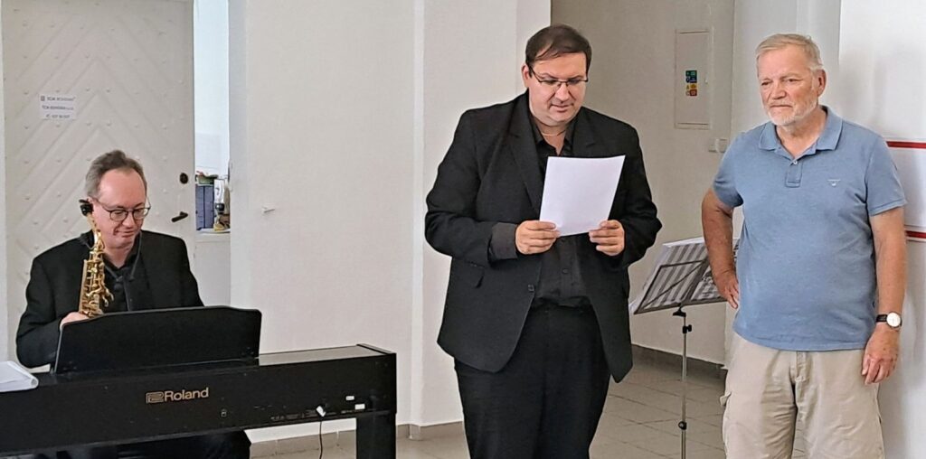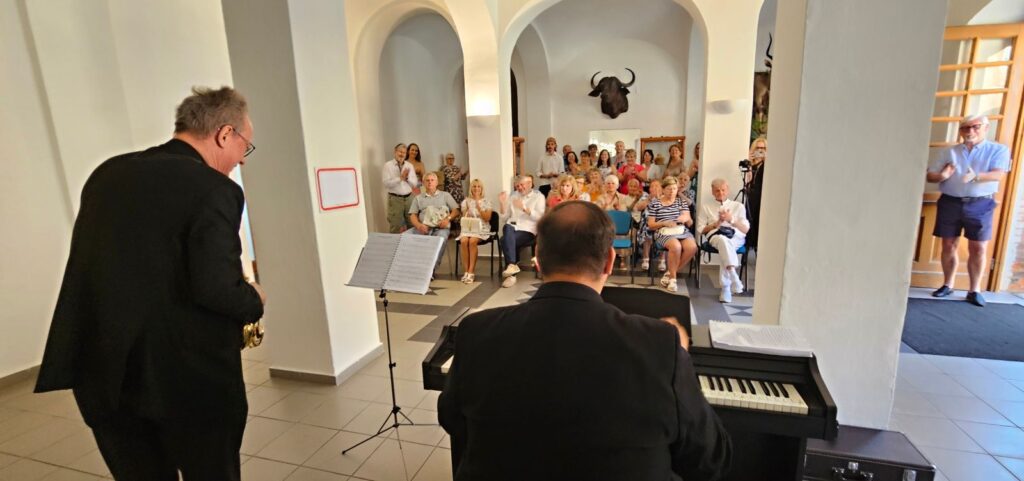 Včerejší vernisáž výstavy Jiřího Suchého proběhla v příjemné atmosféře za hojné účasti hostů. Pan Suchý se sice nemohl osobně zúčastnit, ale poslal srdečnou zdravici, kterou přečetl Jiří Jan Nepomuk Svoboda, ředitel divadla Semafor. Společně se saxofonistou Davidem Vrobelem pak hudebně doprovodili celé zahájení. O výtvarném talentu Jiřího Suchého a jeho jedinečném pohledu na svět, plném laskavé ironie a porozumění, promluvil také Mgr. František Štěrba.