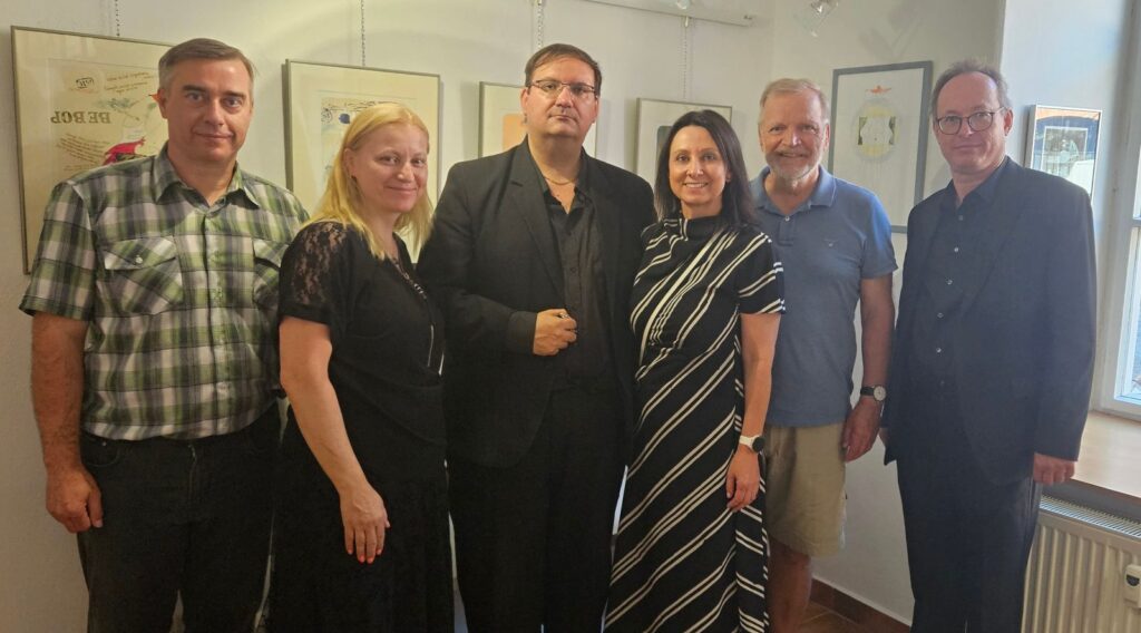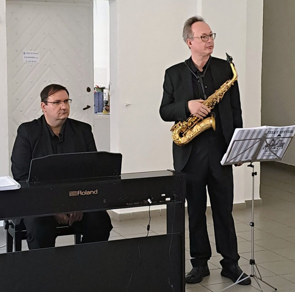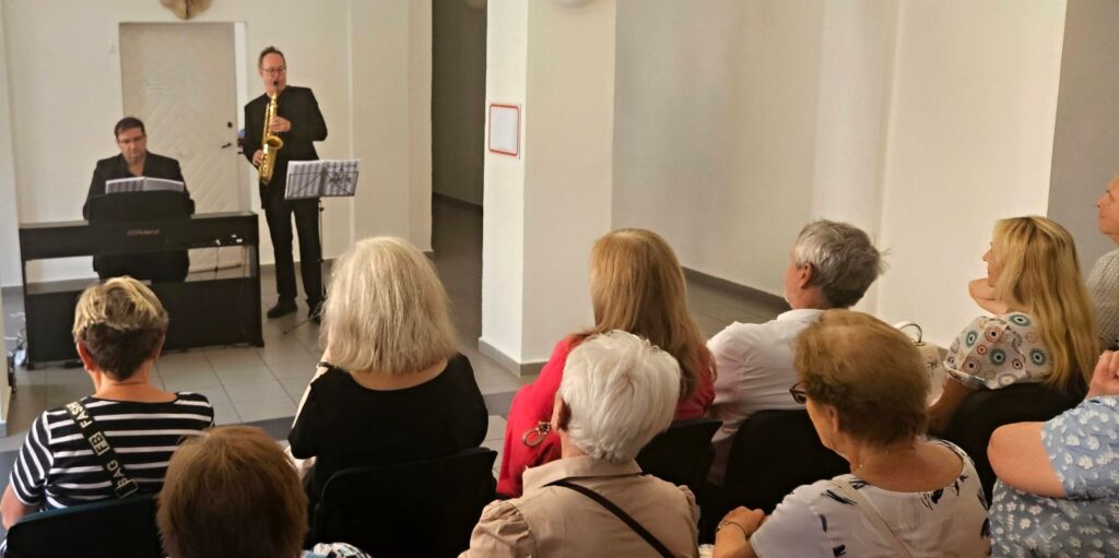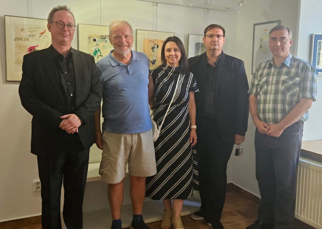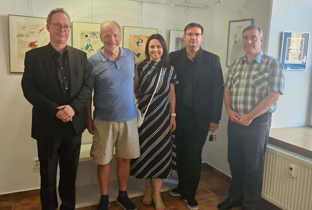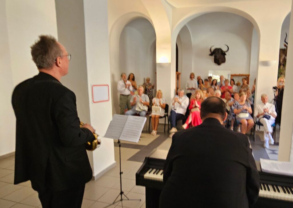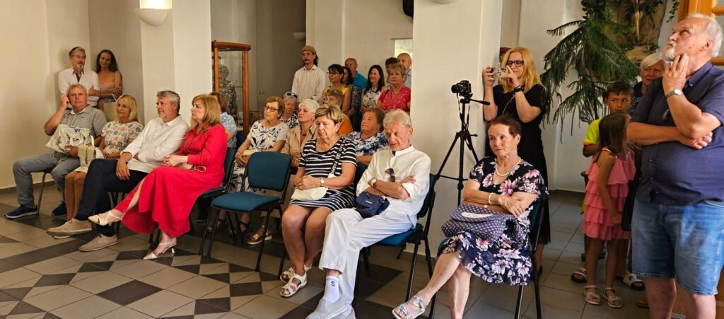 Včerejší vernisáž výstavy Jiřího Suchého proběhla v příjemné atmosféře za hojné účasti hostů. Pan Suchý se sice nemohl osobně zúčastnit, ale poslal srdečnou zdravici, kterou přečetl Jiří Jan Nepomuk Svoboda, ředitel divadla Semafor. Společně se saxofonistou Davidem Vrobelem pak hudebně doprovodili celé zahájení. O výtvarném talentu Jiřího Suchého a jeho jedinečném pohledu na svět, plném laskavé ironie a porozumění, promluvil také Mgr. František Štěrba.