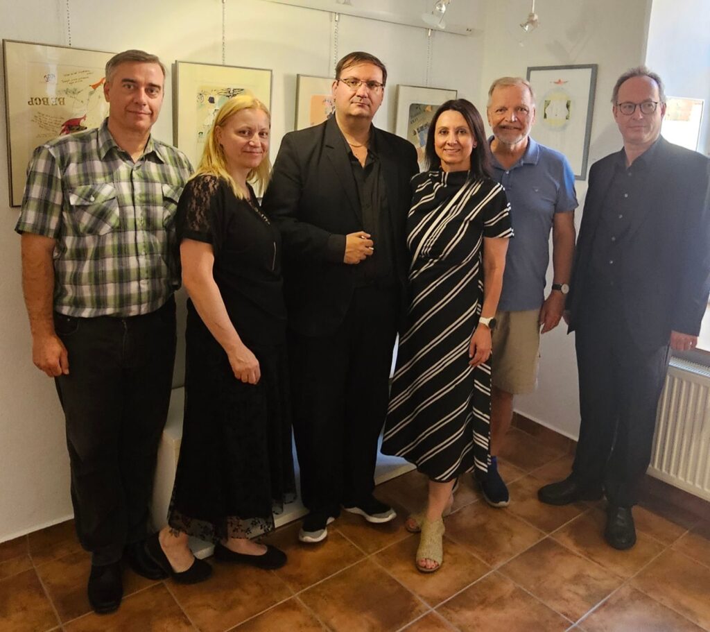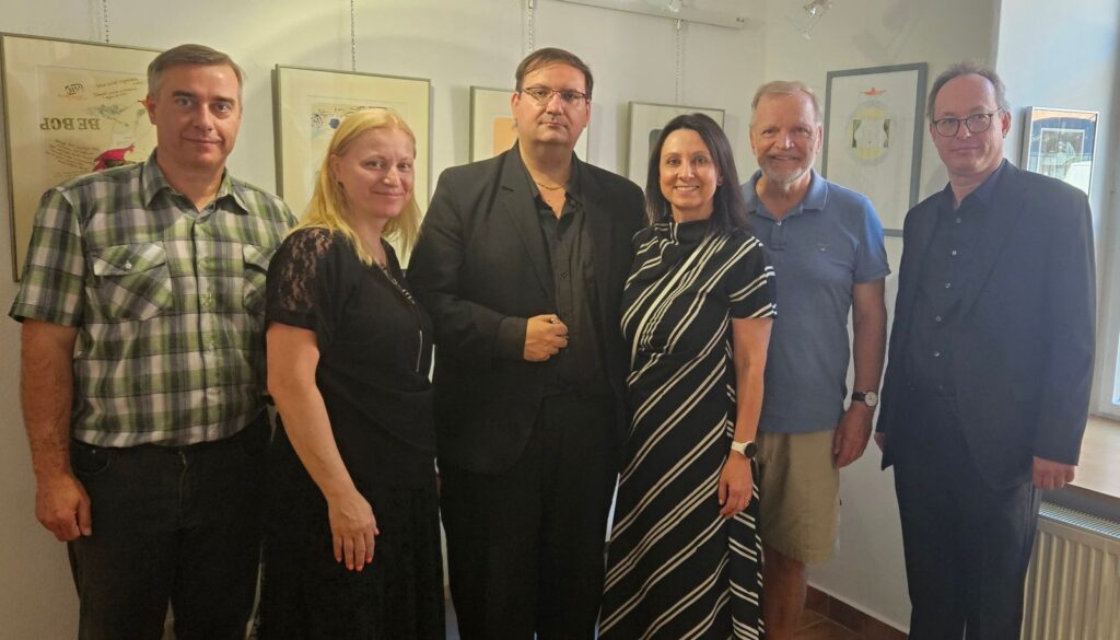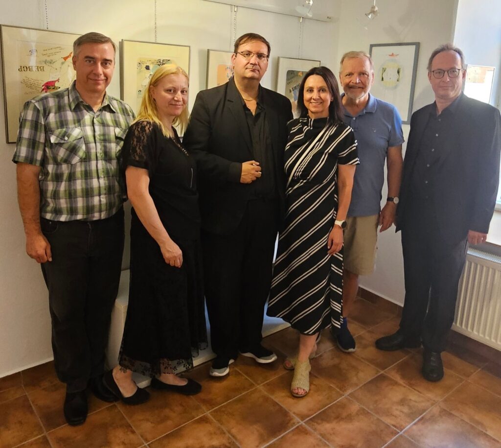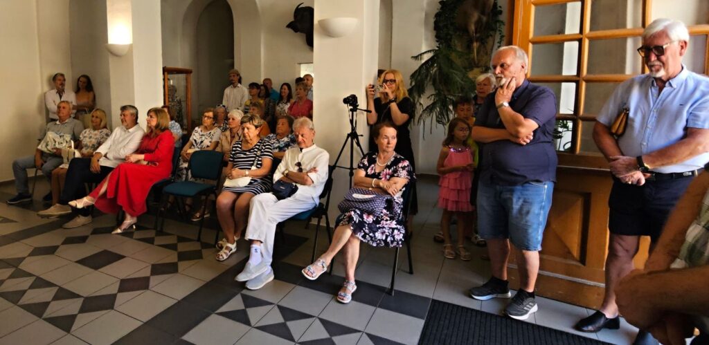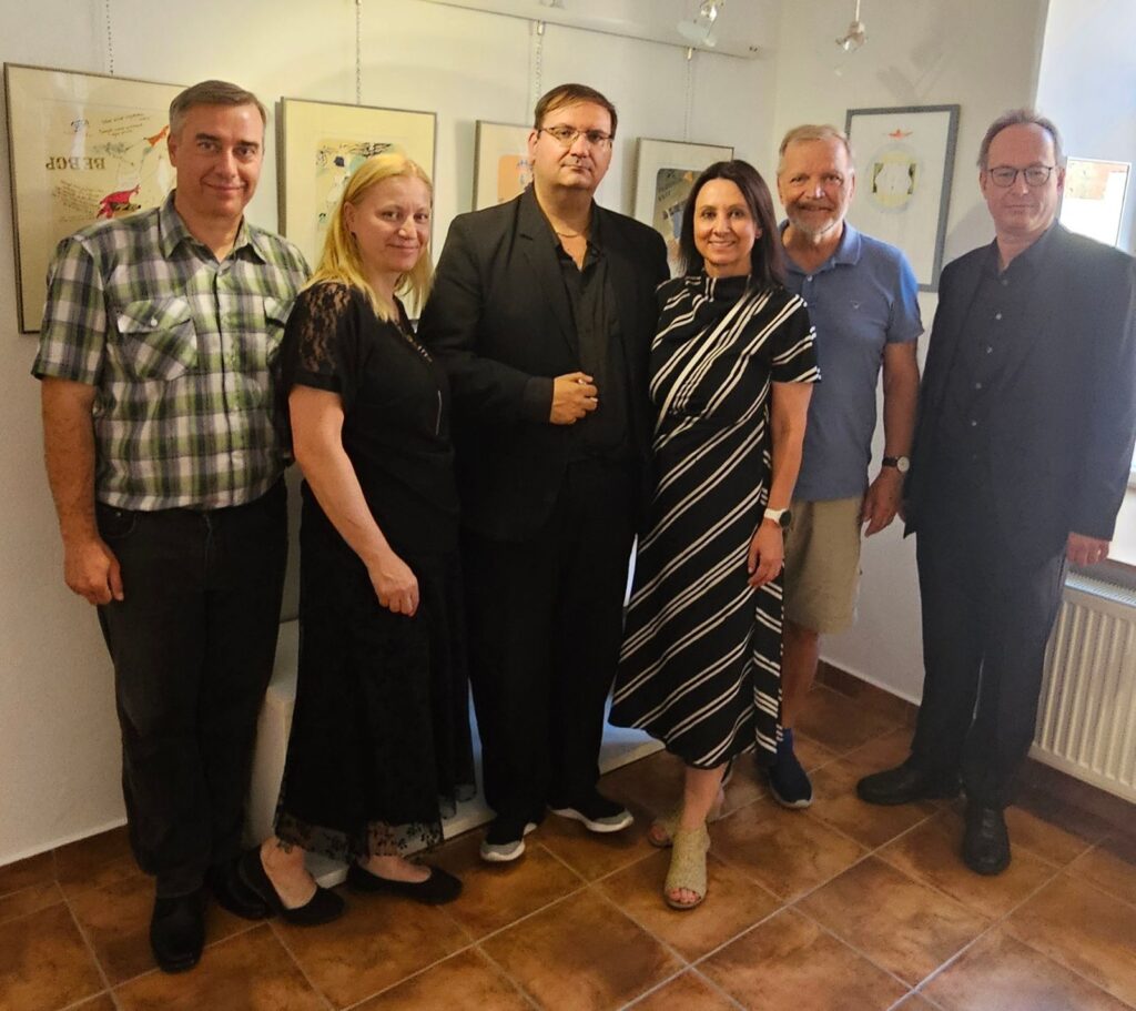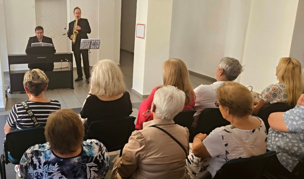 Včerejší vernisáž výstavy Jiřího Suchého proběhla v příjemné atmosféře za hojné účasti hostů. Pan Suchý se sice nemohl osobně zúčastnit, ale poslal srdečnou zdravici, kterou přečetl Jiří Jan Nepomuk Svoboda, ředitel divadla Semafor. Společně se saxofonistou Davidem Vrobelem pak hudebně doprovodili celé zahájení. O výtvarném talentu Jiřího Suchého a jeho jedinečném pohledu na svět, plném laskavé ironie a porozumění, promluvil také Mgr. František Štěrba.