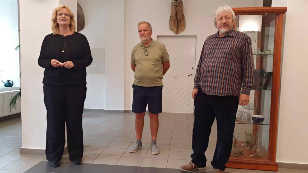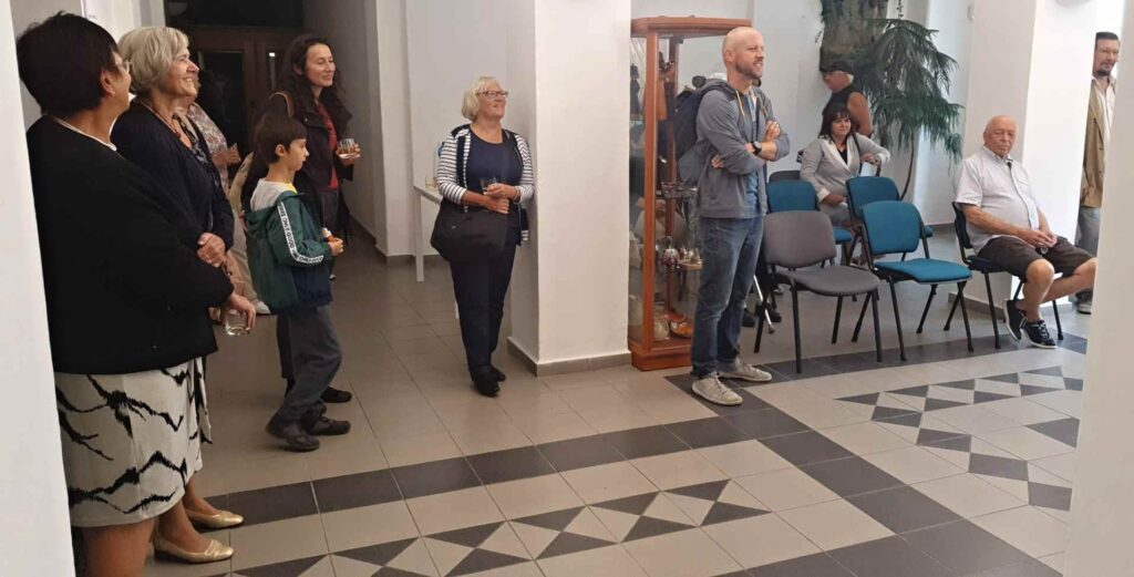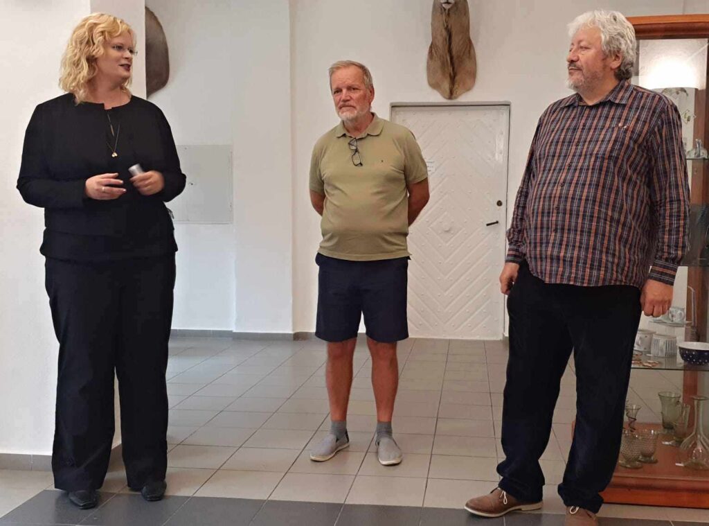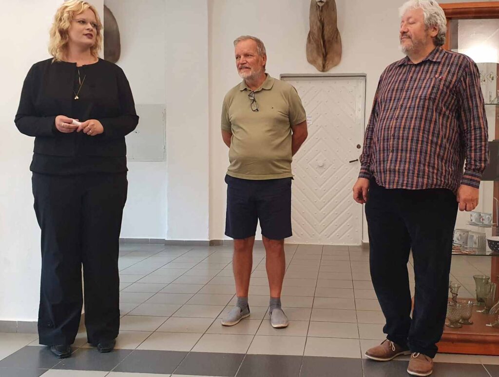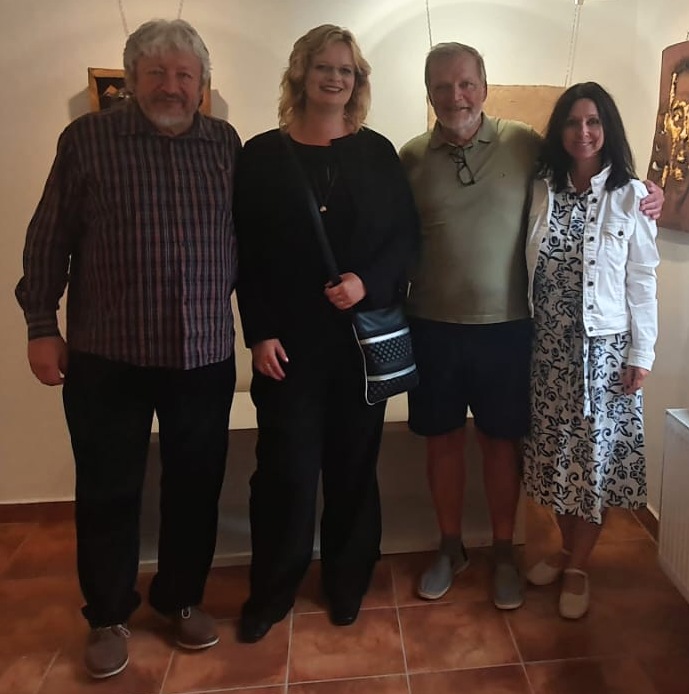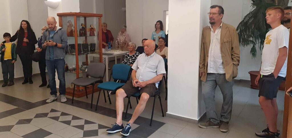 Bohužel se nemohla zúčastnit naše galeristka Marie Hanušová, pozdravujeme jí alespoň touto cestou. Vernisáž uvedl Pavel Frelich. O autorovi, jeho dílech a širších souvislostech jeho tvorby zasvěceně promluvila Mgr. Zuzana Duchková,Ph.D.  V autorovi se nezapřel kantor z Jihočeské univerzity a poslechli jsme si pěknou přednášku o jeho tvorbě a technikách. Je to autor mnoha postupů a materiálů od plechu, kameniny a porcelánu až po sklo. Prozradil nám jeden ze svých know-how, sice podrobný, ale asi těžko napodobitelný pracovní postup. Jedna ze zúčastněných, Martina, s dojetím objevila jedno z děl, pro které byl modelem její táta, moc pěkný příběh.