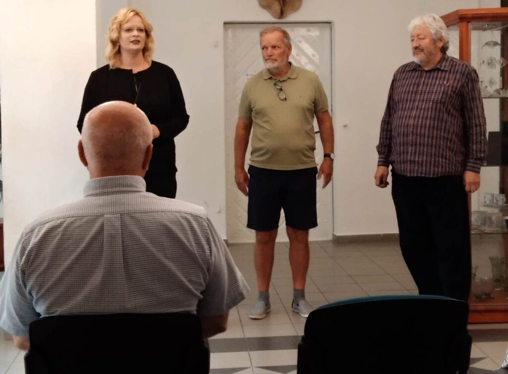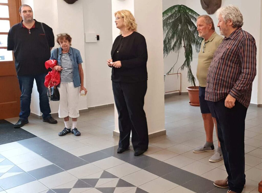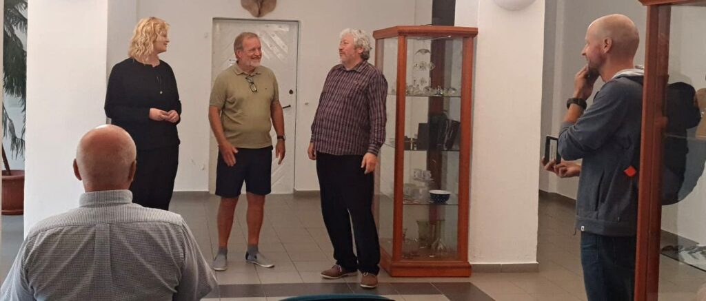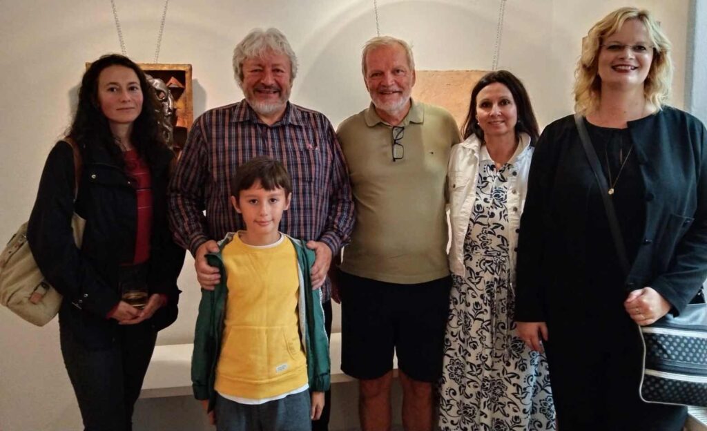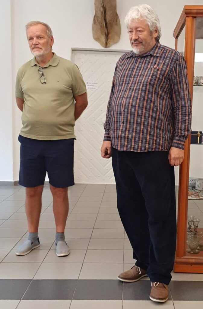 Bohužel se nemohla zúčastnit naše galeristka Marie Hanušová, pozdravujeme jí alespoň touto cestou. Vernisáž uvedl Pavel Frelich. O autorovi, jeho dílech a širších souvislostech jeho tvorby zasvěceně promluvila Mgr. Zuzana Duchková,Ph.D.  V autorovi se nezapřel kantor z Jihočeské univerzity a poslechli jsme si pěknou přednášku o jeho tvorbě a technikách. Je to autor mnoha postupů a materiálů od plechu, kameniny a porcelánu až po sklo. Prozradil nám jeden ze svých know-how, sice podrobný, ale asi těžko napodobitelný pracovní postup. Jedna ze zúčastněných, Martina, s dojetím objevila jedno z děl, pro které byl modelem její táta, moc pěkný příběh.