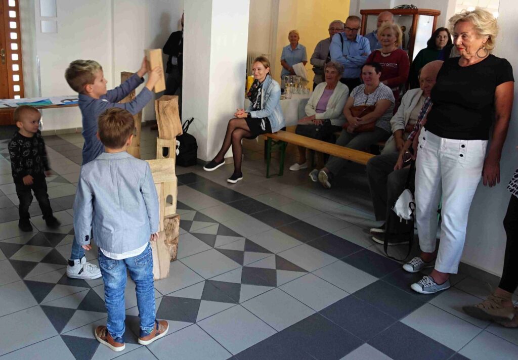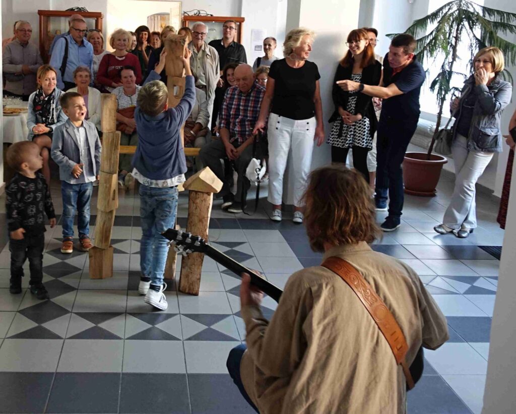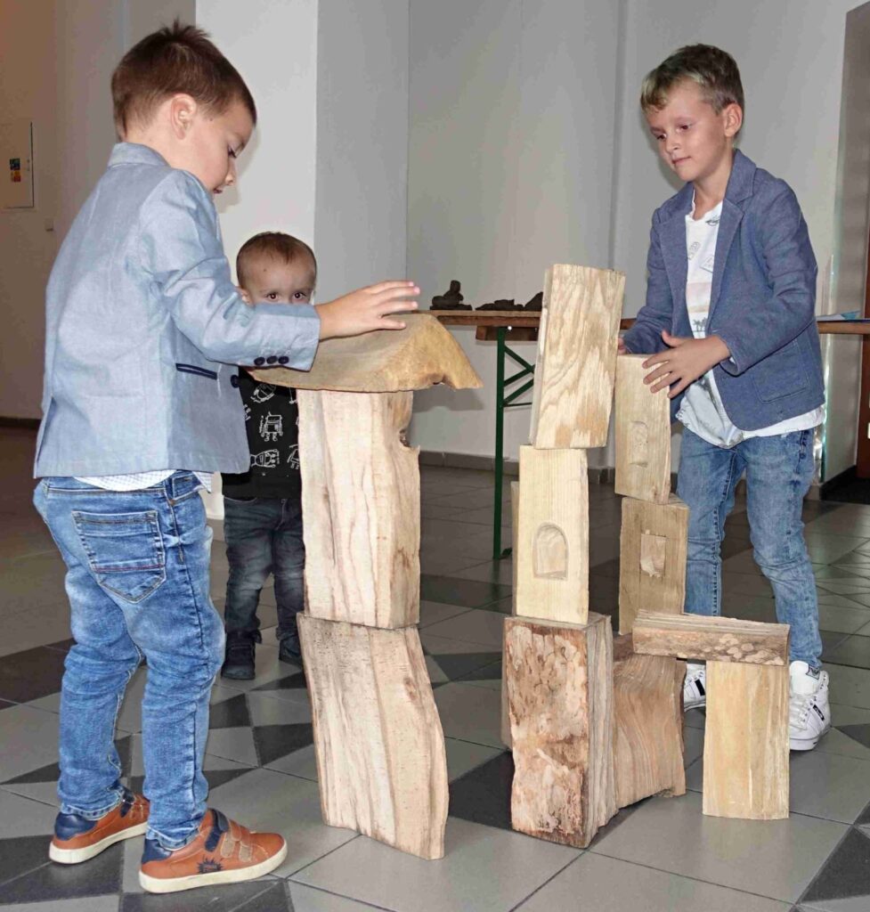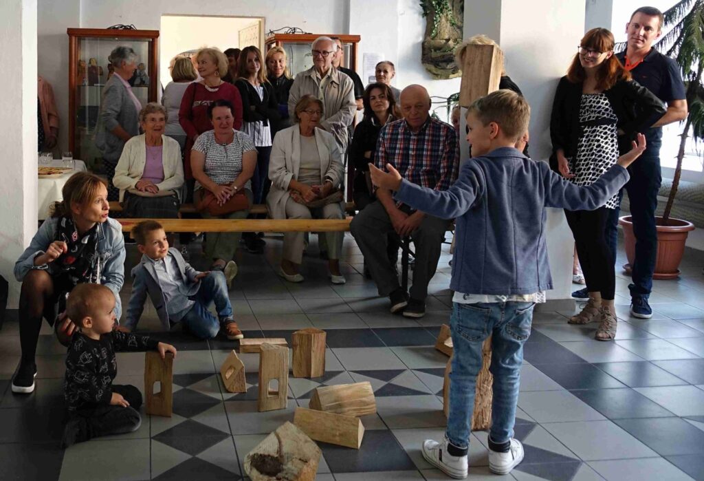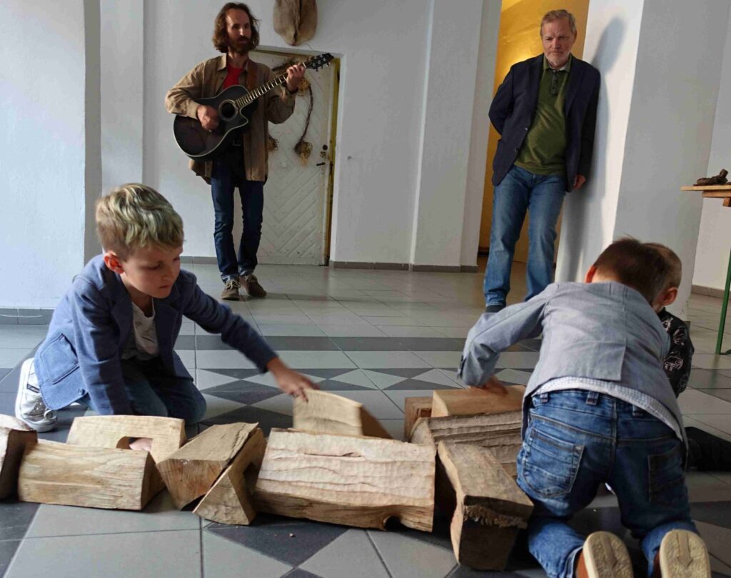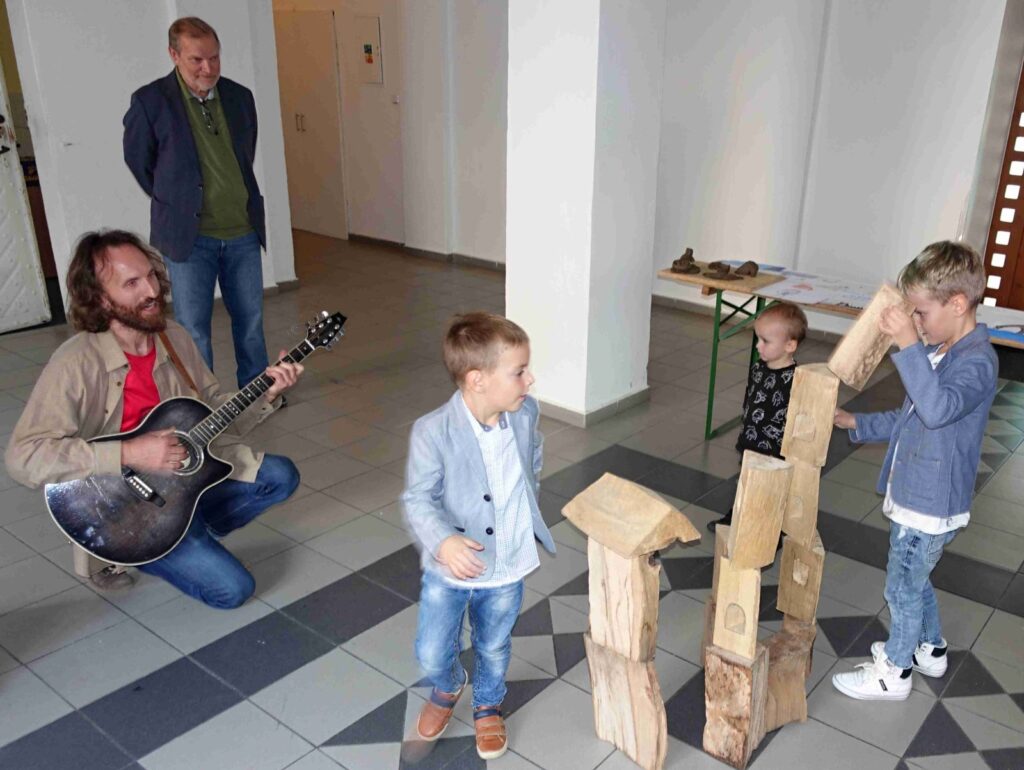 Na vernisáži nám chyběla naše galeristka Marie Hanušová, všichni zúčastnění popřáli Marii brzké uzdravení a rychlou rekonvalescenci, držíme palce. Takže zahájení udělal Pavel Frelich, o díle autora promluvil Bohumír Frelich. V kulturním programu vystoupil autor se zhudebněnou poezií Jan Skácela. No a tentokrát děti inspirováni písněmi stavěli věže nebo znázorňovaly řeku pomocí špalíků dřeva.