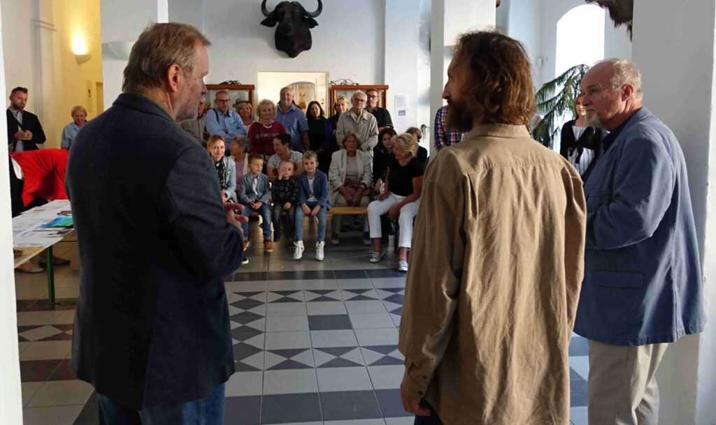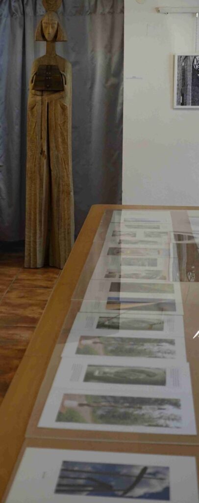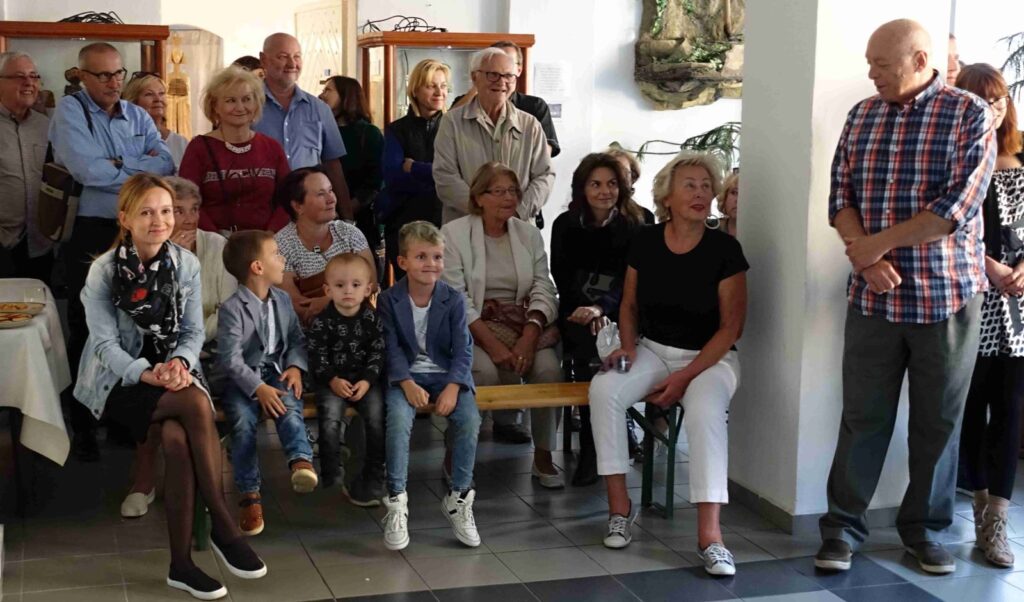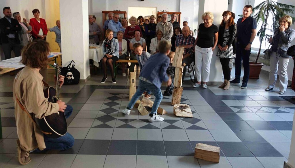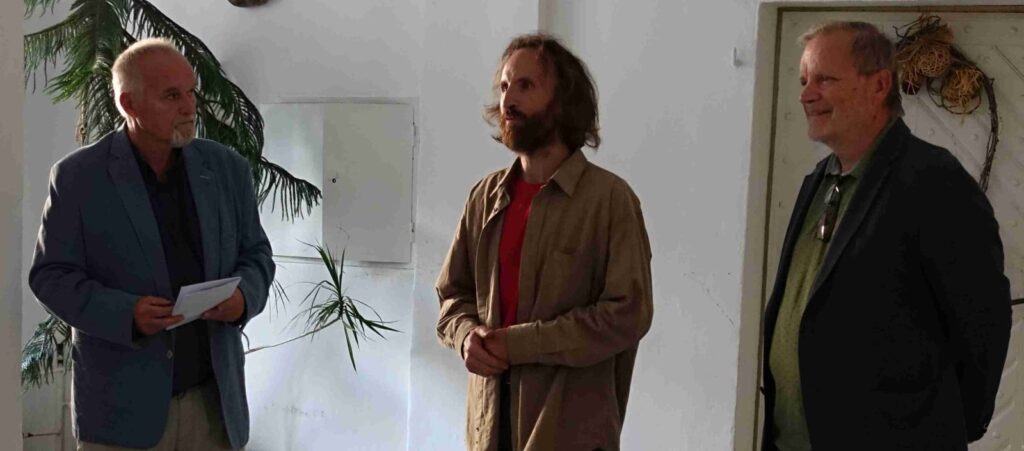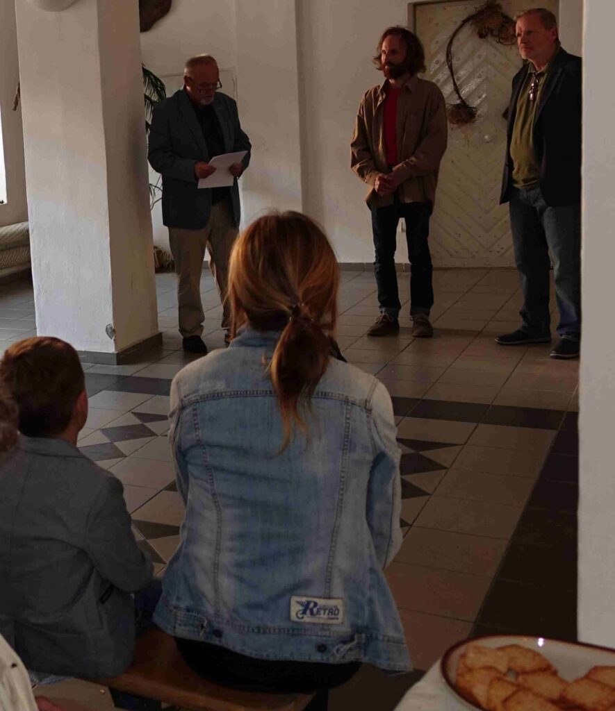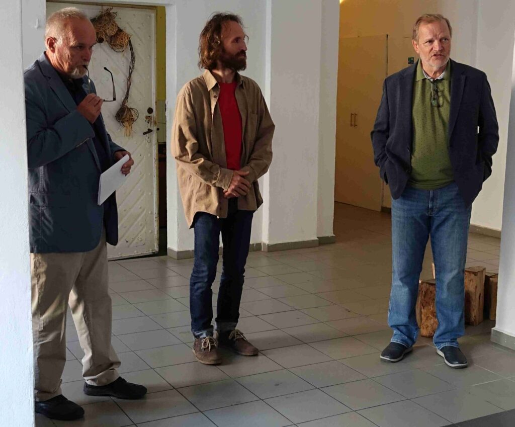 Na vernisáži nám chyběla naše galeristka Marie Hanušová, všichni zúčastnění popřáli Marii brzké uzdravení a rychlou rekonvalescenci, držíme palce. Takže zahájení udělal Pavel Frelich, o díle autora promluvil Bohumír Frelich. V kulturním programu vystoupil autor se zhudebněnou poezií Jan Skácela. No a tentokrát děti inspirováni písněmi stavěli věže nebo znázorňovaly řeku pomocí špalíků dřeva.