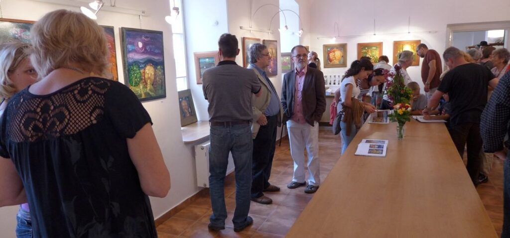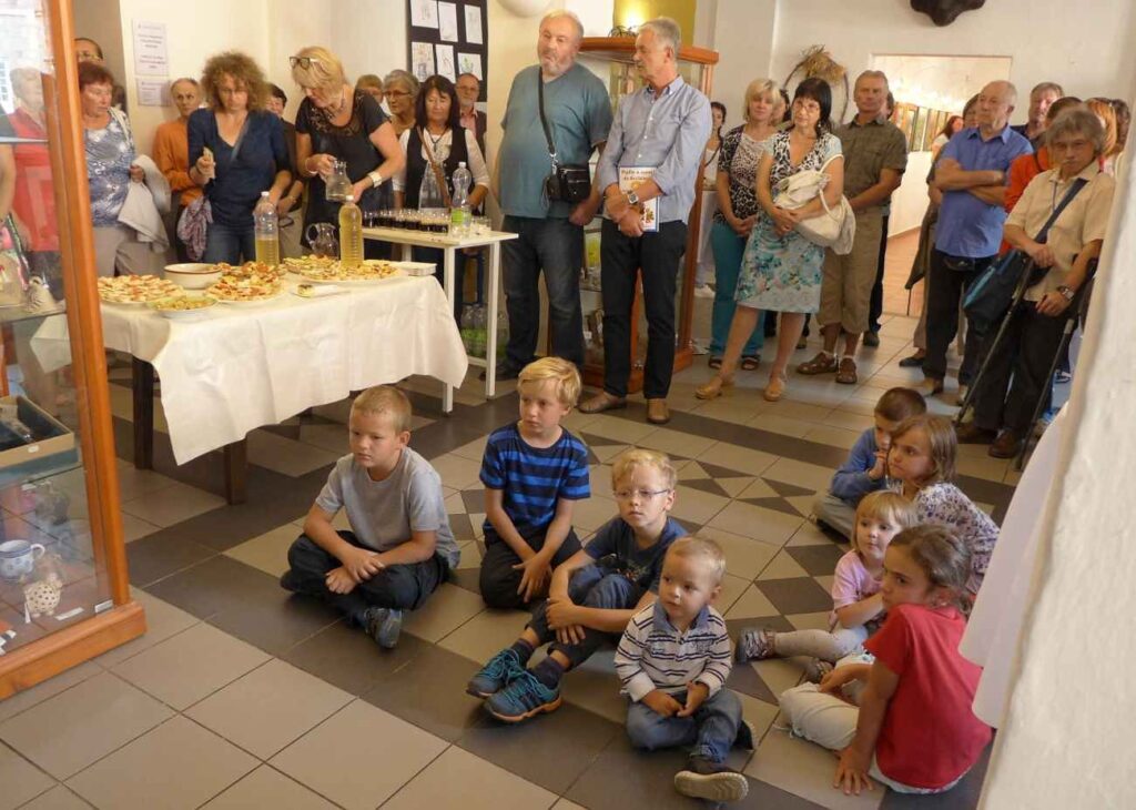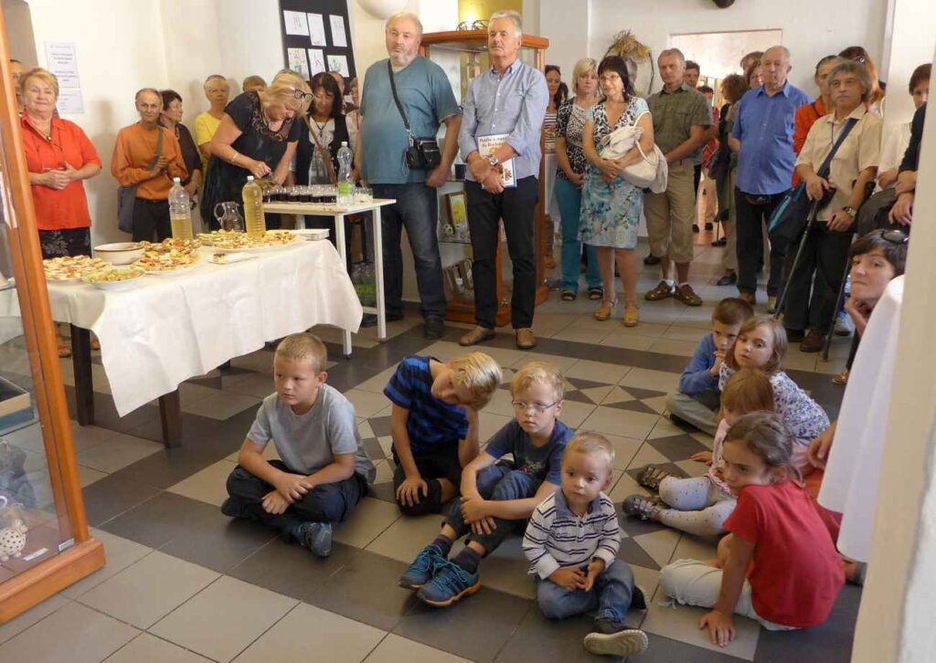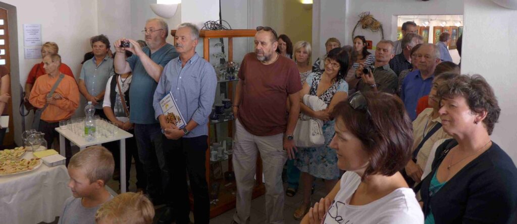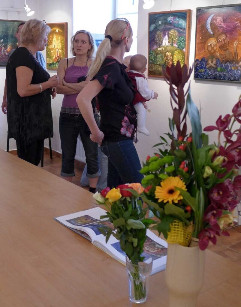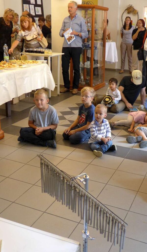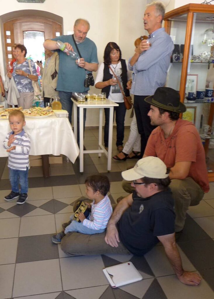 Vernisáž zahájil Pavel Frelich, k výstavě promluvila galeristka Marie Hanušová a víno nalévala paní Renata Štolbová. Za krásnou výstavu dostala kytičku, stejně jako Marie Hanušová nejen k svátku. Hudební vystoupení zaujalo i děti, jak je vidět na fotografiích z vernisáže.