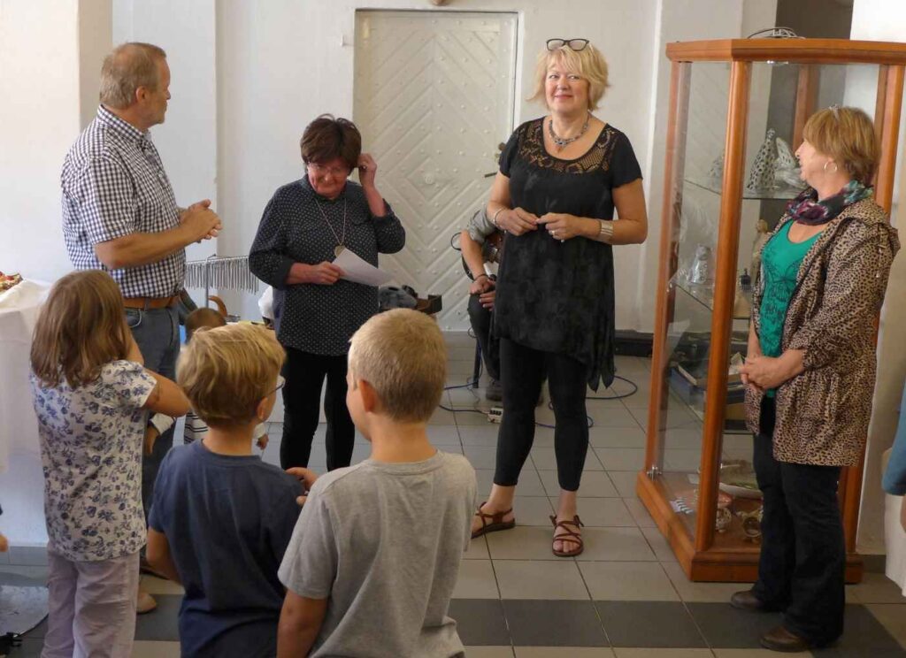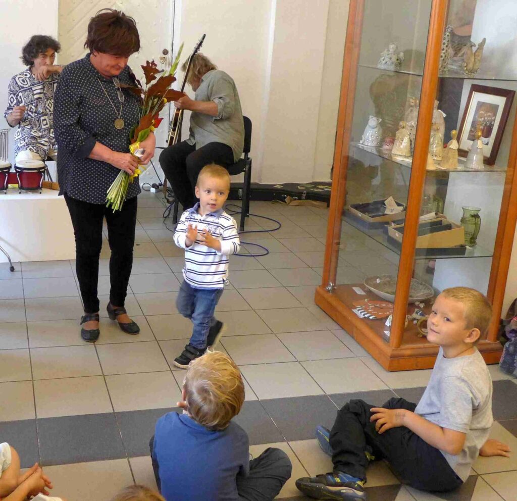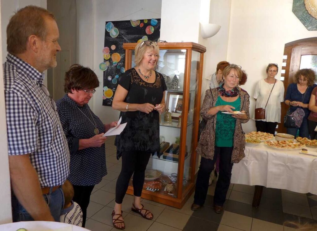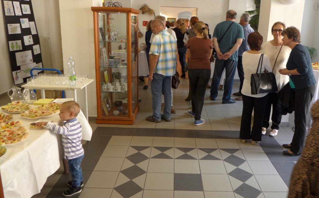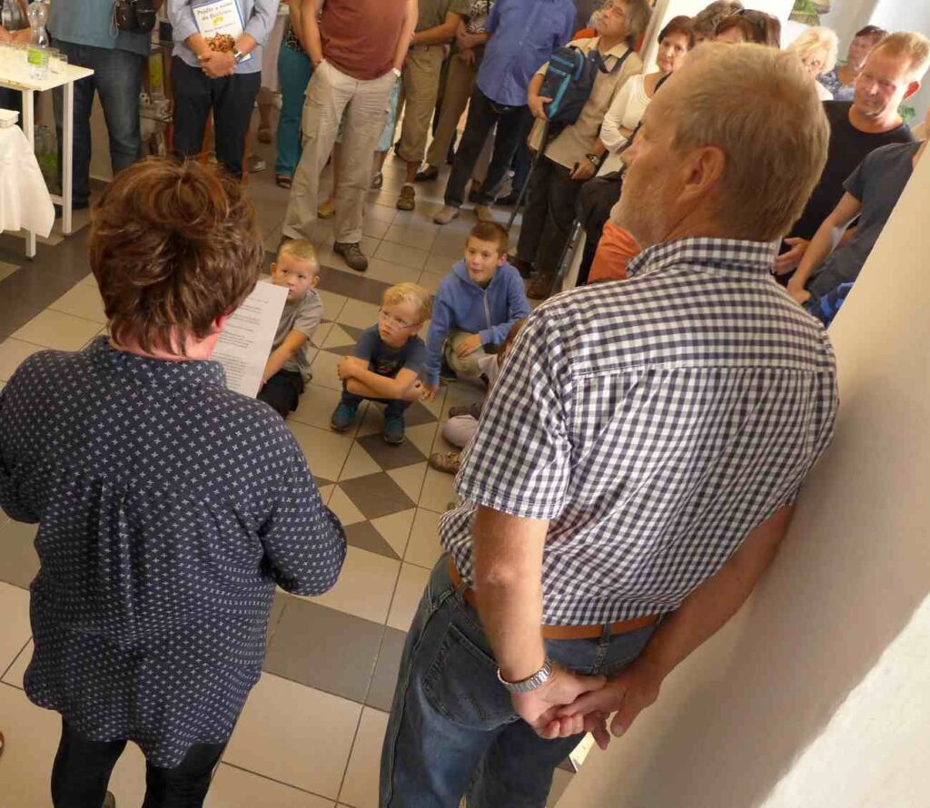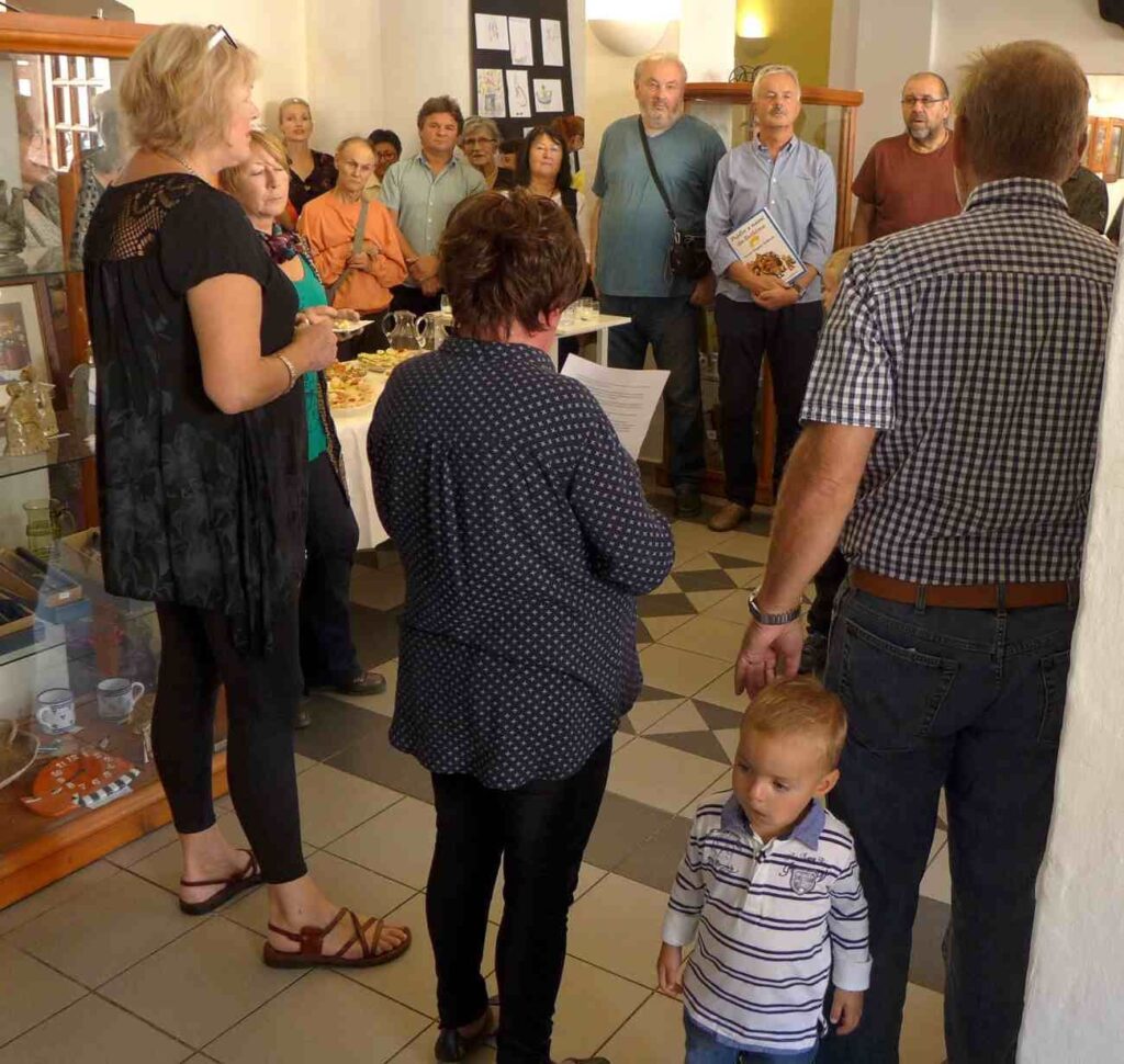 Vernisáž zahájil Pavel Frelich, k výstavě promluvila galeristka Marie Hanušová a víno nalévala paní Renata Štolbová. Za krásnou výstavu dostala kytičku, stejně jako Marie Hanušová nejen k svátku. Hudební vystoupení zaujalo i děti, jak je vidět na fotografiích z vernisáže.