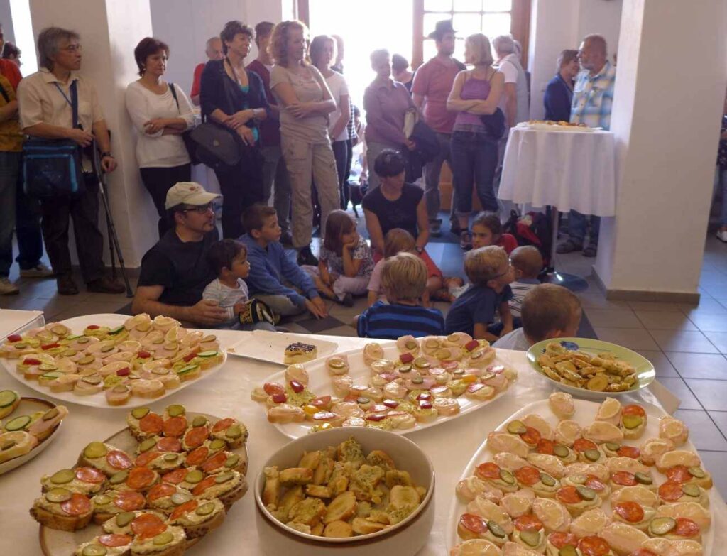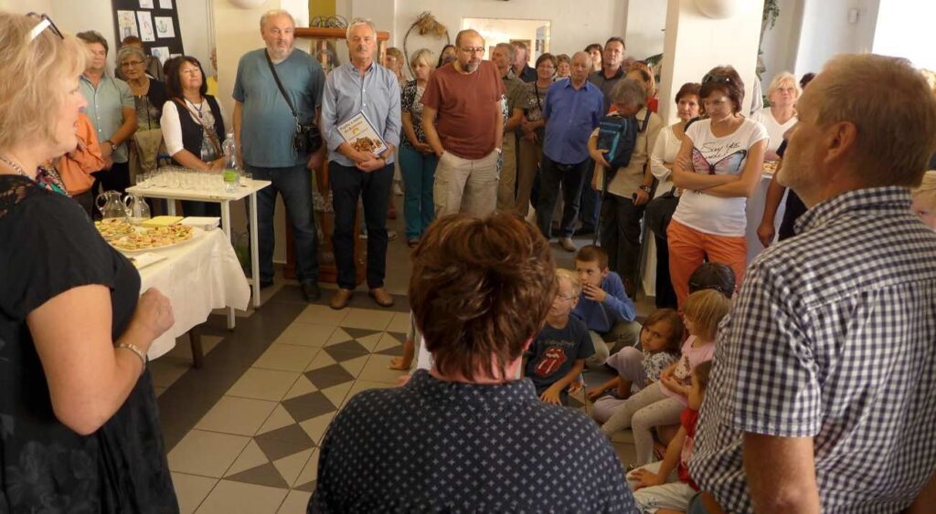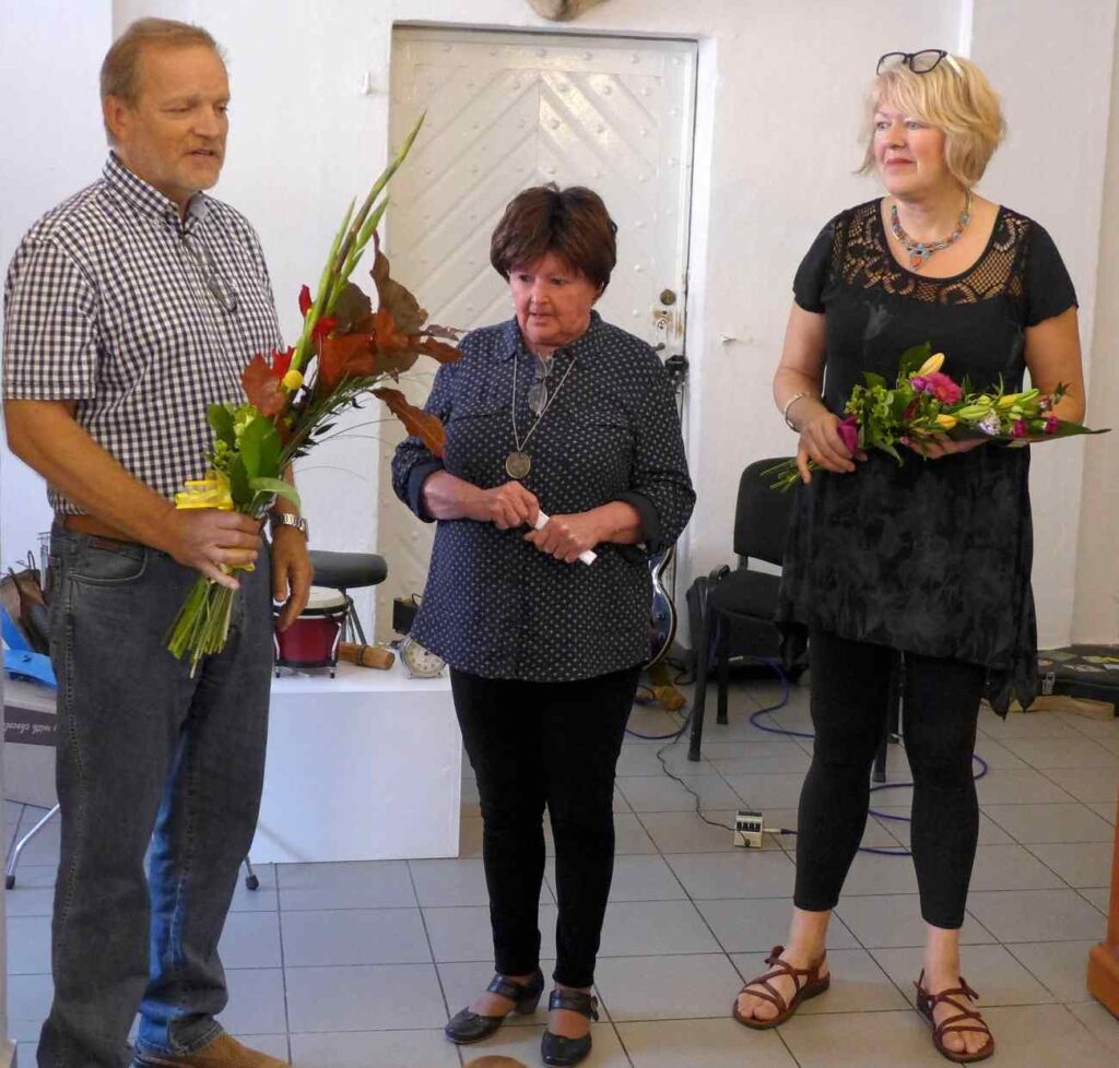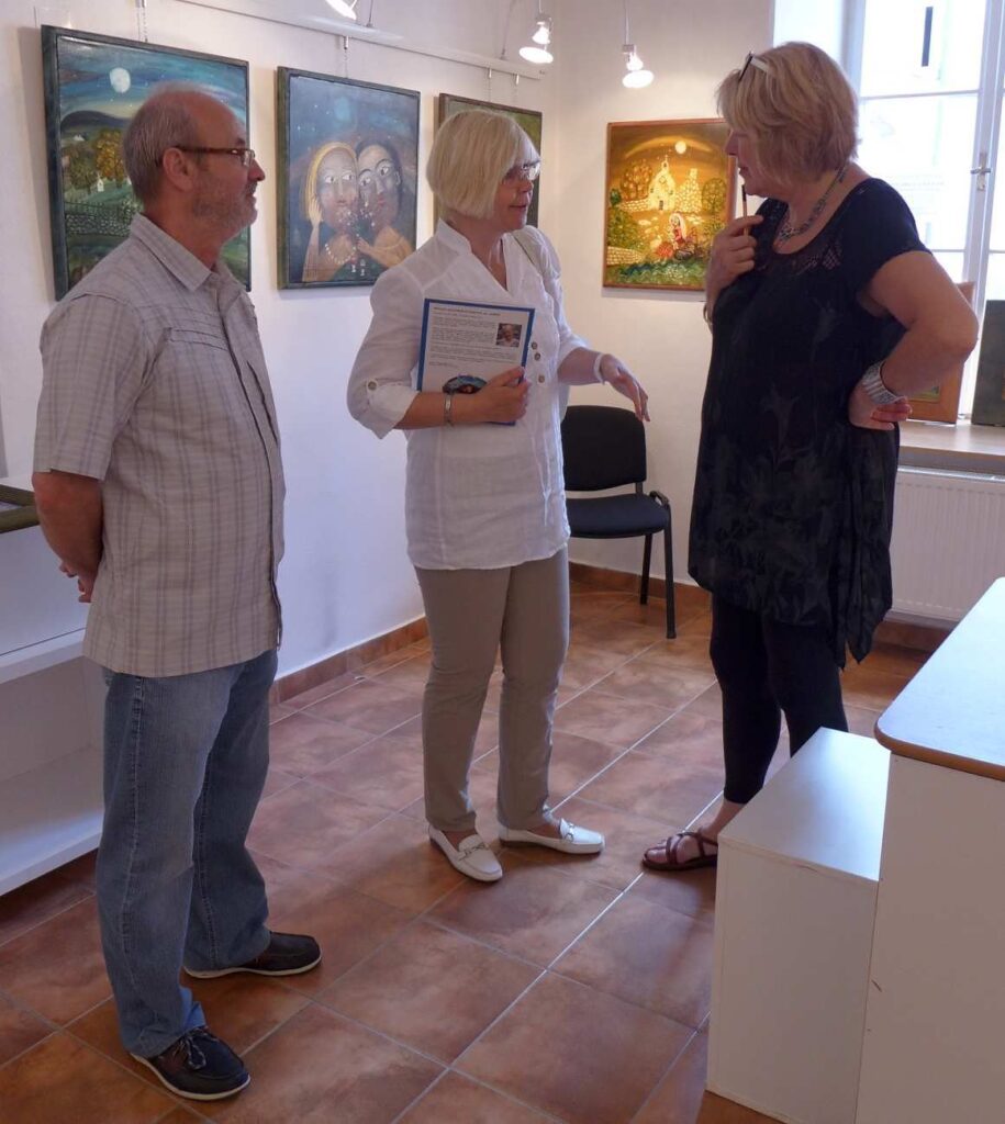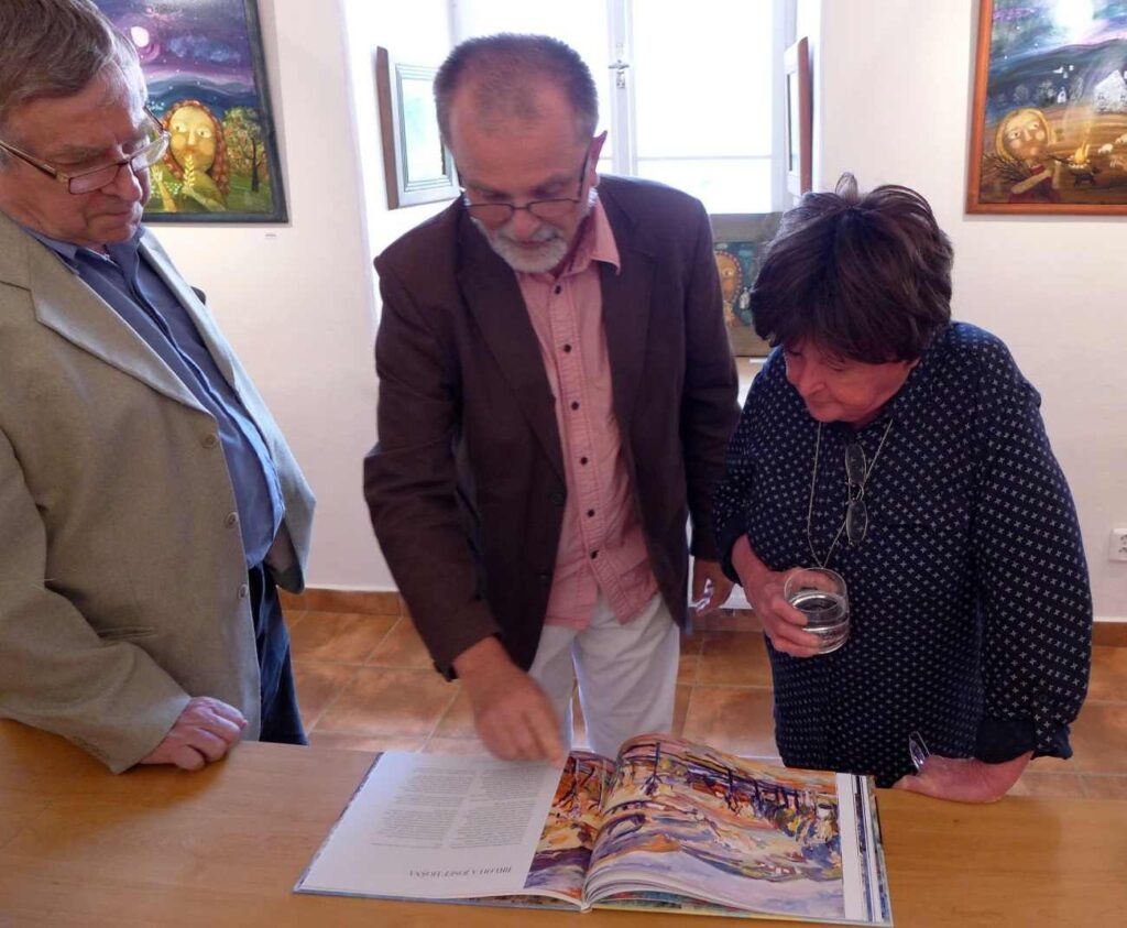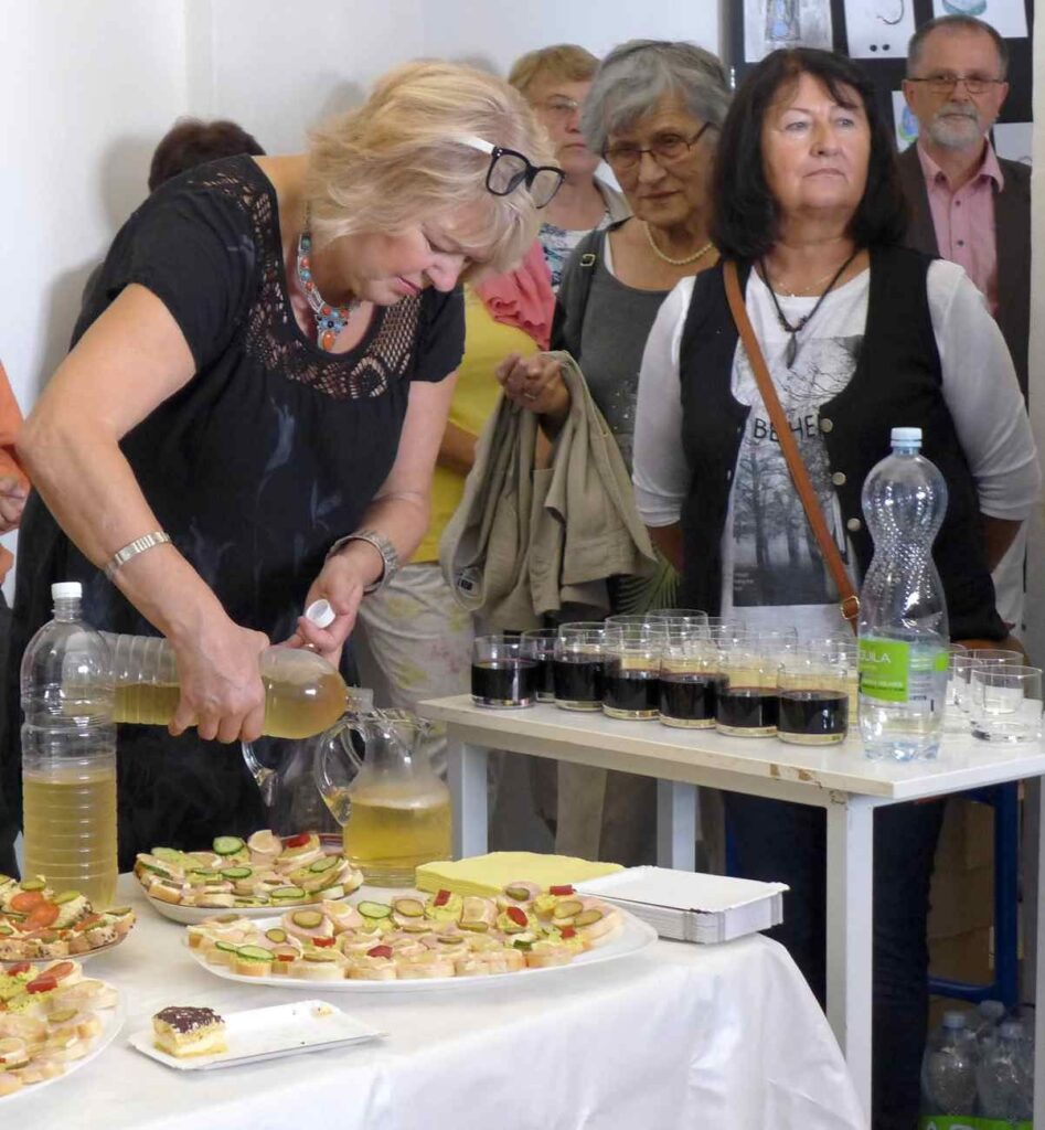 Vernisáž zahájil Pavel Frelich, k výstavě promluvila galeristka Marie Hanušová a víno nalévala paní Renata Štolbová. Za krásnou výstavu dostala kytičku, stejně jako Marie Hanušová nejen k svátku. Hudební vystoupení zaujalo i děti, jak je vidět na fotografiích z vernisáže.