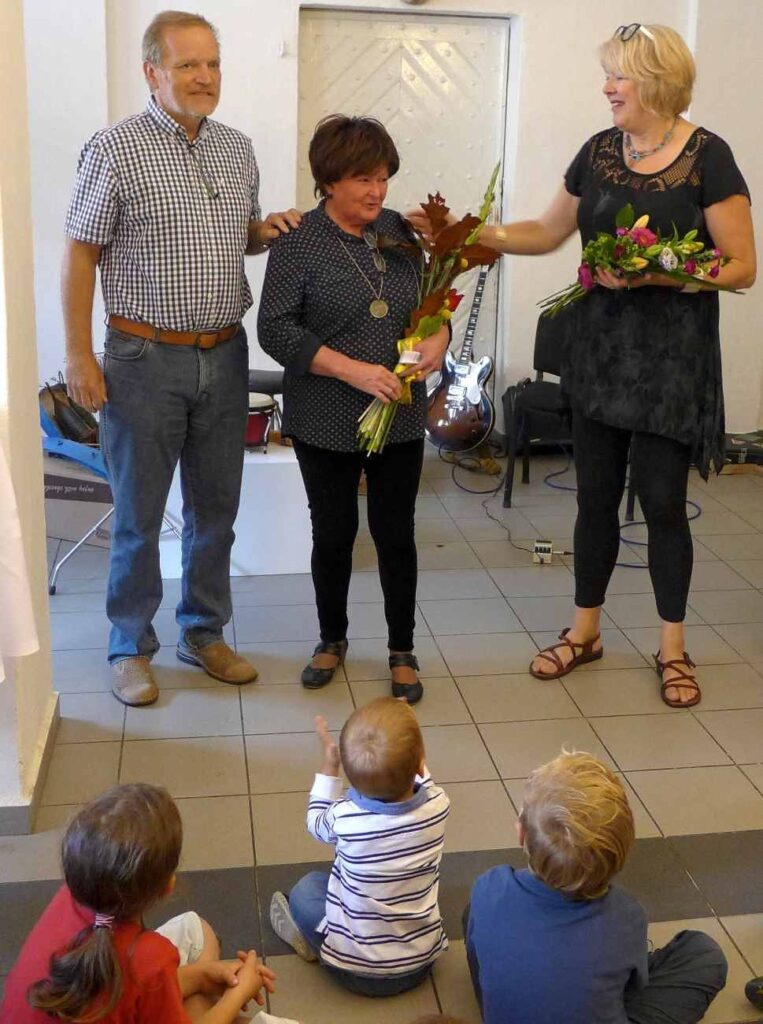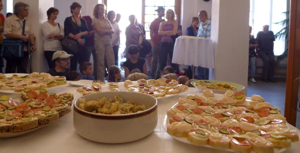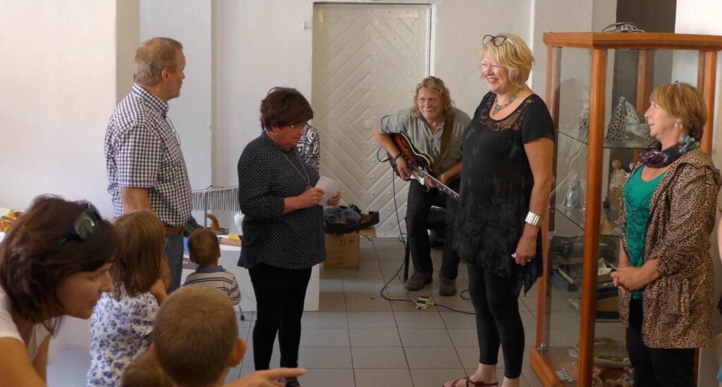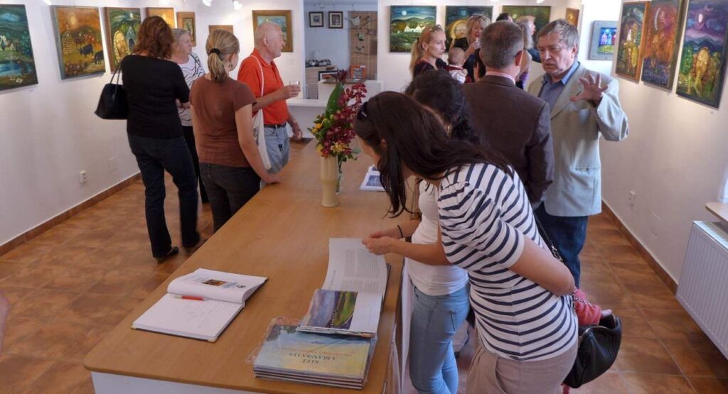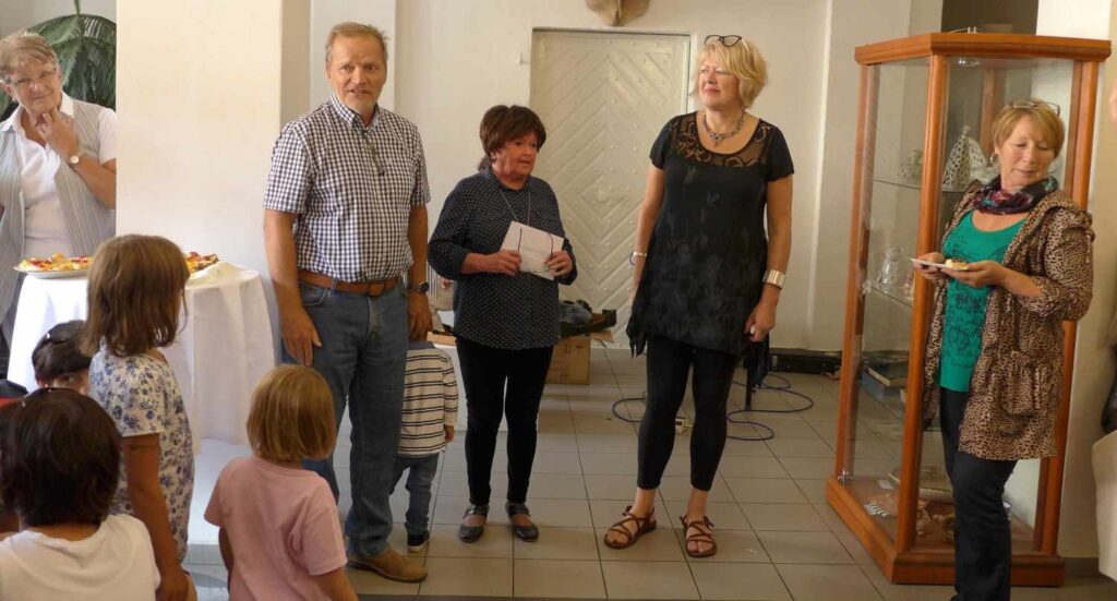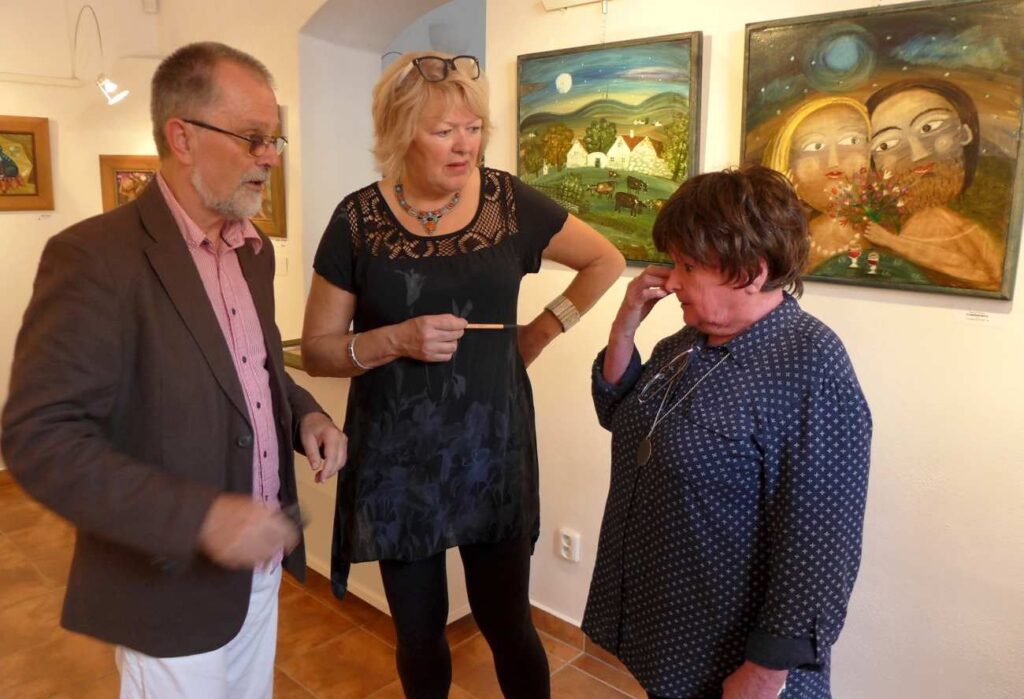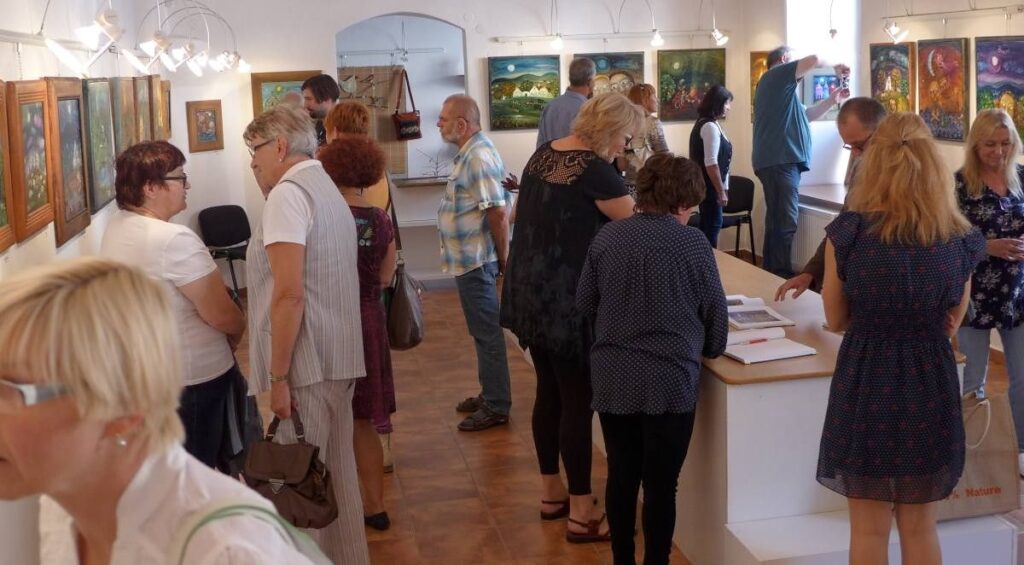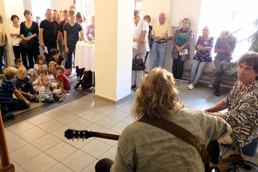 Vernisáž zahájil Pavel Frelich, k výstavě promluvila galeristka Marie Hanušová a víno nalévala paní Renata Štolbová. Za krásnou výstavu dostala kytičku, stejně jako Marie Hanušová nejen k svátku. Hudební vystoupení zaujalo i děti, jak je vidět na fotografiích z vernisáže.
